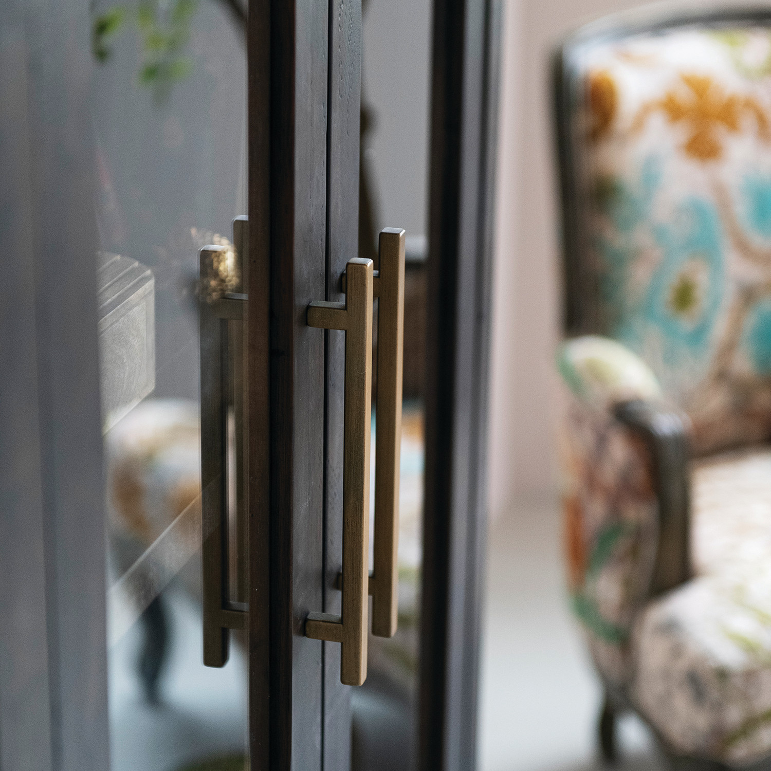 Recycled Pine Wood Cabinet with 2 Glass Doors, 3 Shelves & Gold Finish Metal Handles
