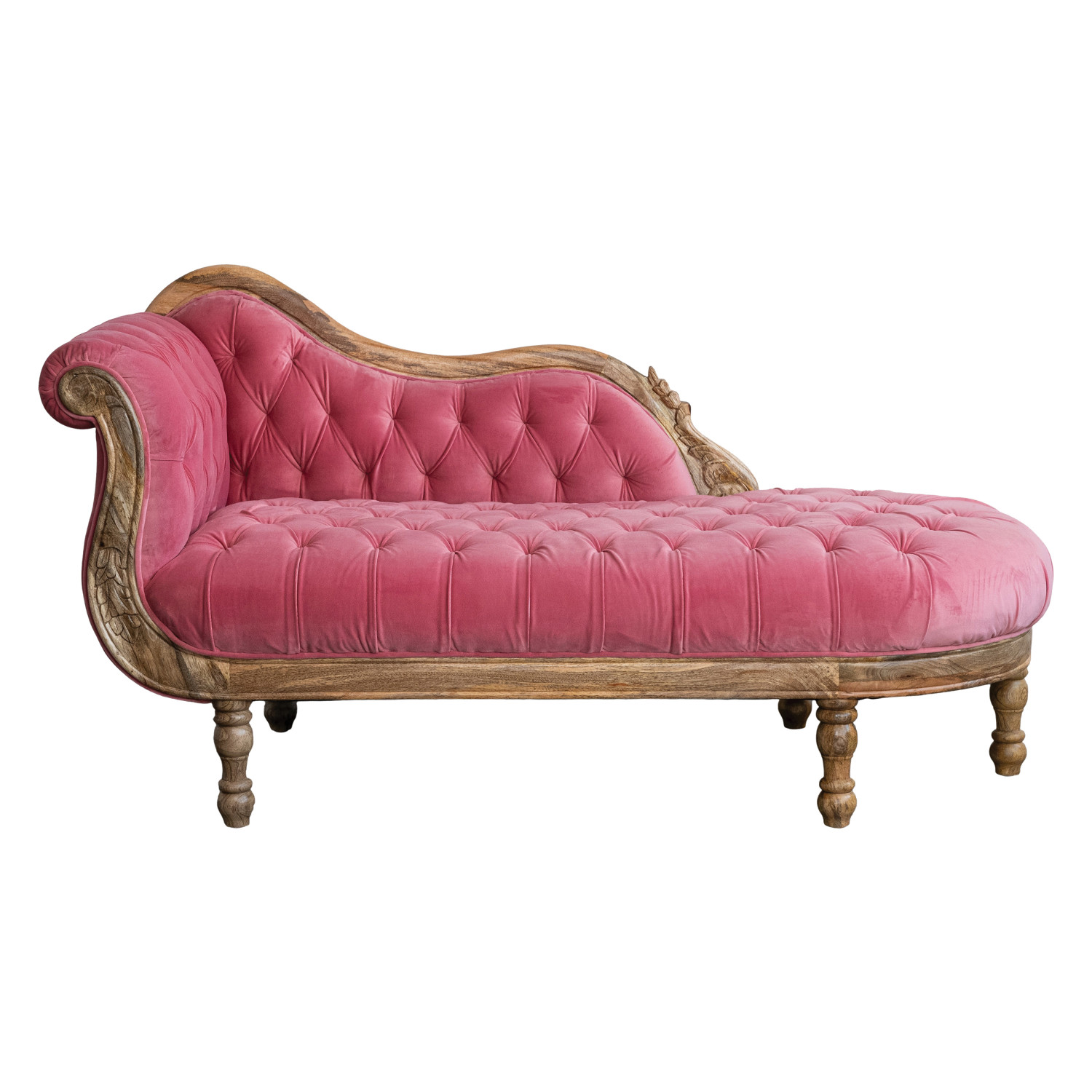 Velvet Upholstered Chaise Lounge with Carved Mango Wood Frame, Pink & Natural