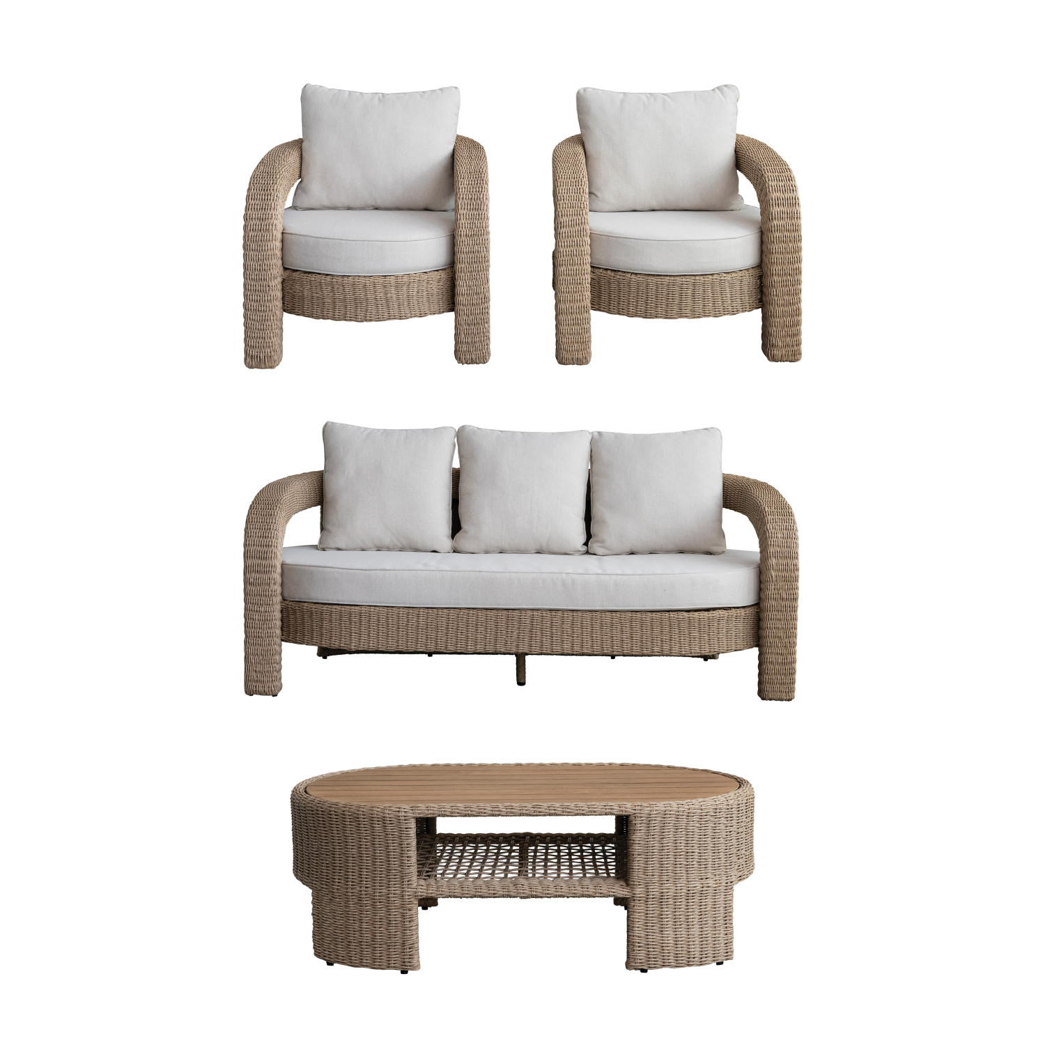 Catalog Name: 73"W x 32-1/4"D x 34"H Hand-Woven Plastic Indoor/Outdoor Sofa & (2) 46"W x 26-1/4"D x 17-1/4"H Plastic Wicker Chairs w/ 48"L x 26-1/4"W x 17-1/4"H Oval Acacia Wood Table & Fabric Cushions, Natural & Cream Color, Set of 4, Truck Ship