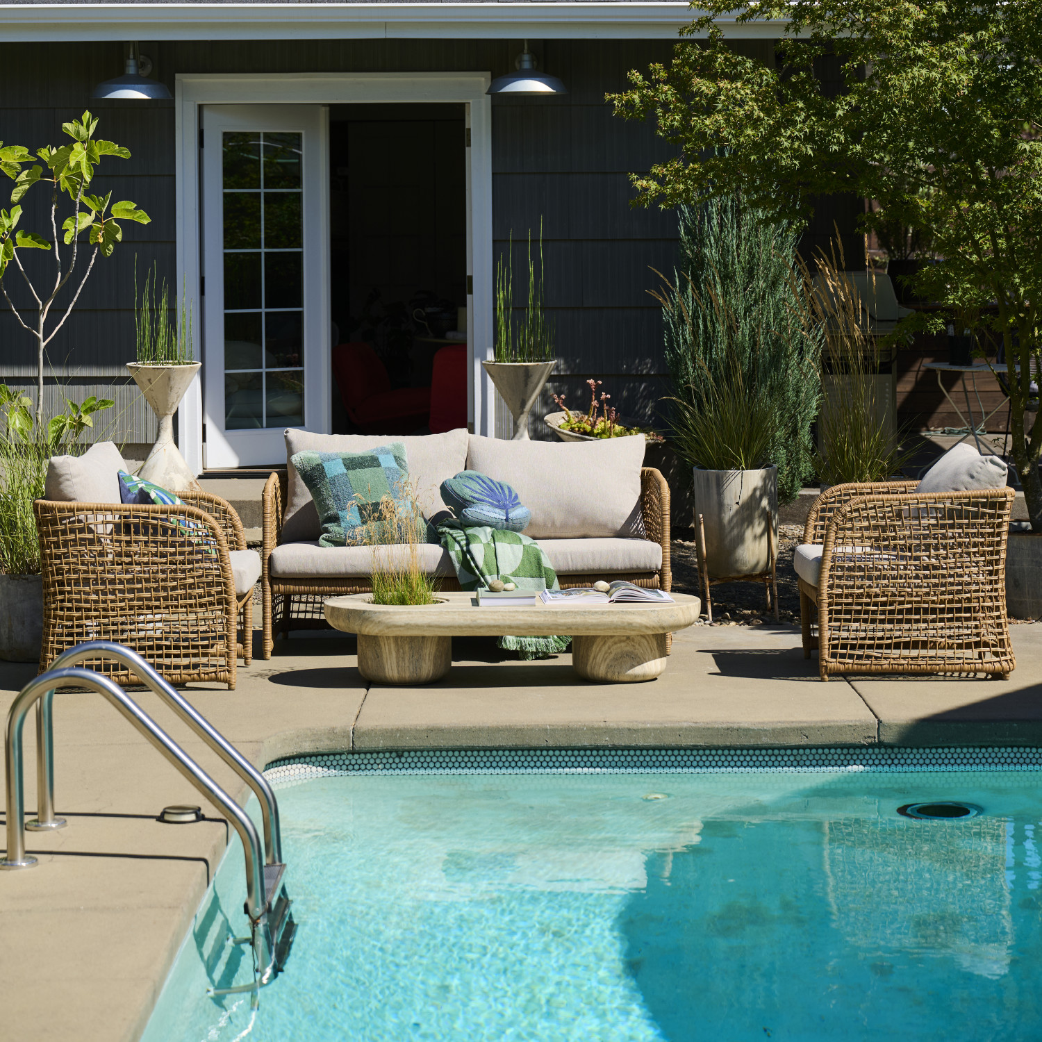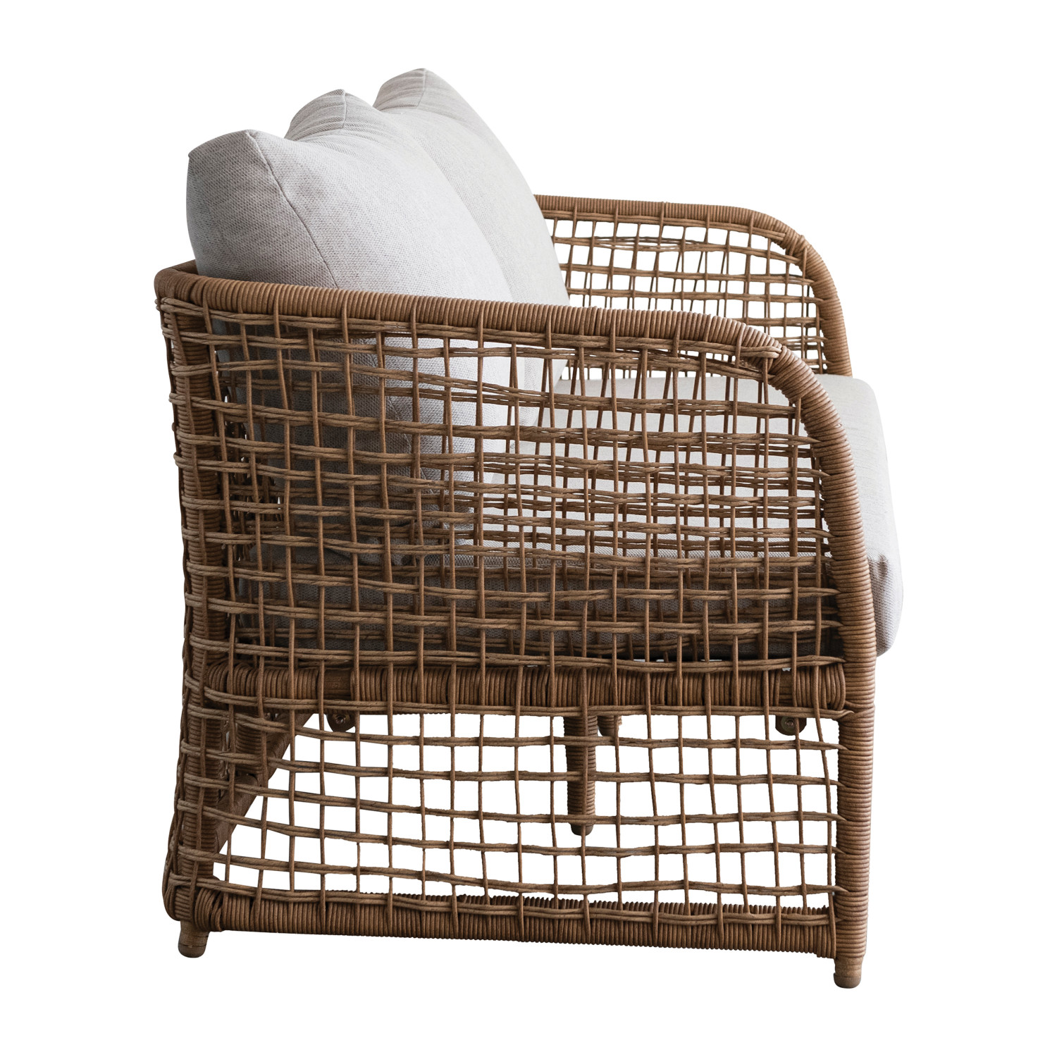 Catalog Name: 64-1/2"W x 34-1/4"D x 30-1/2"H Hand-Woven Plastic Wicker Indoor/Outdoor Sofa w/ Fabric Cushions, Natural & Cream Color, Truck Ship