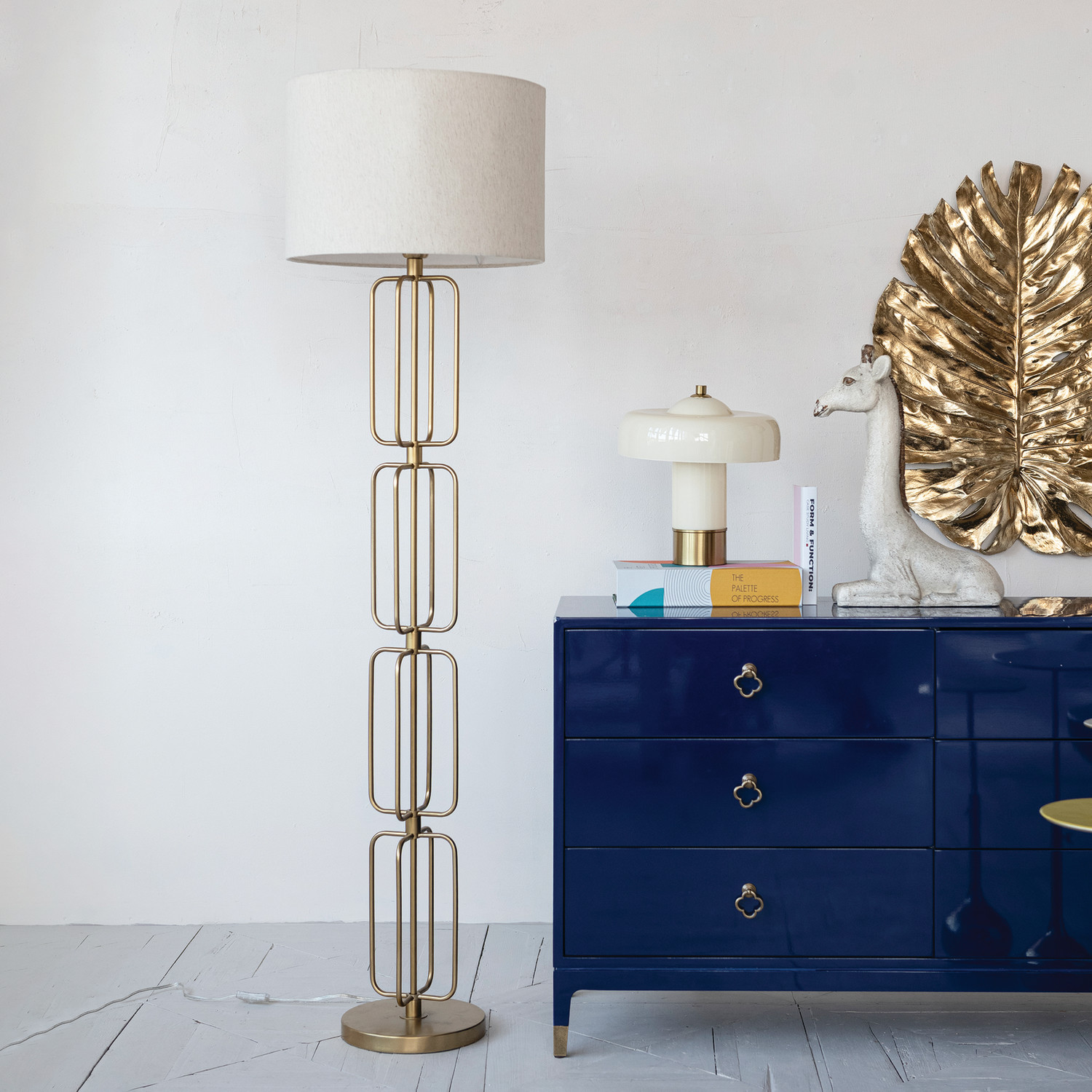 Metal Wire Floor Lamp with Cotton Shade & Inline Switch, Gold Finish
