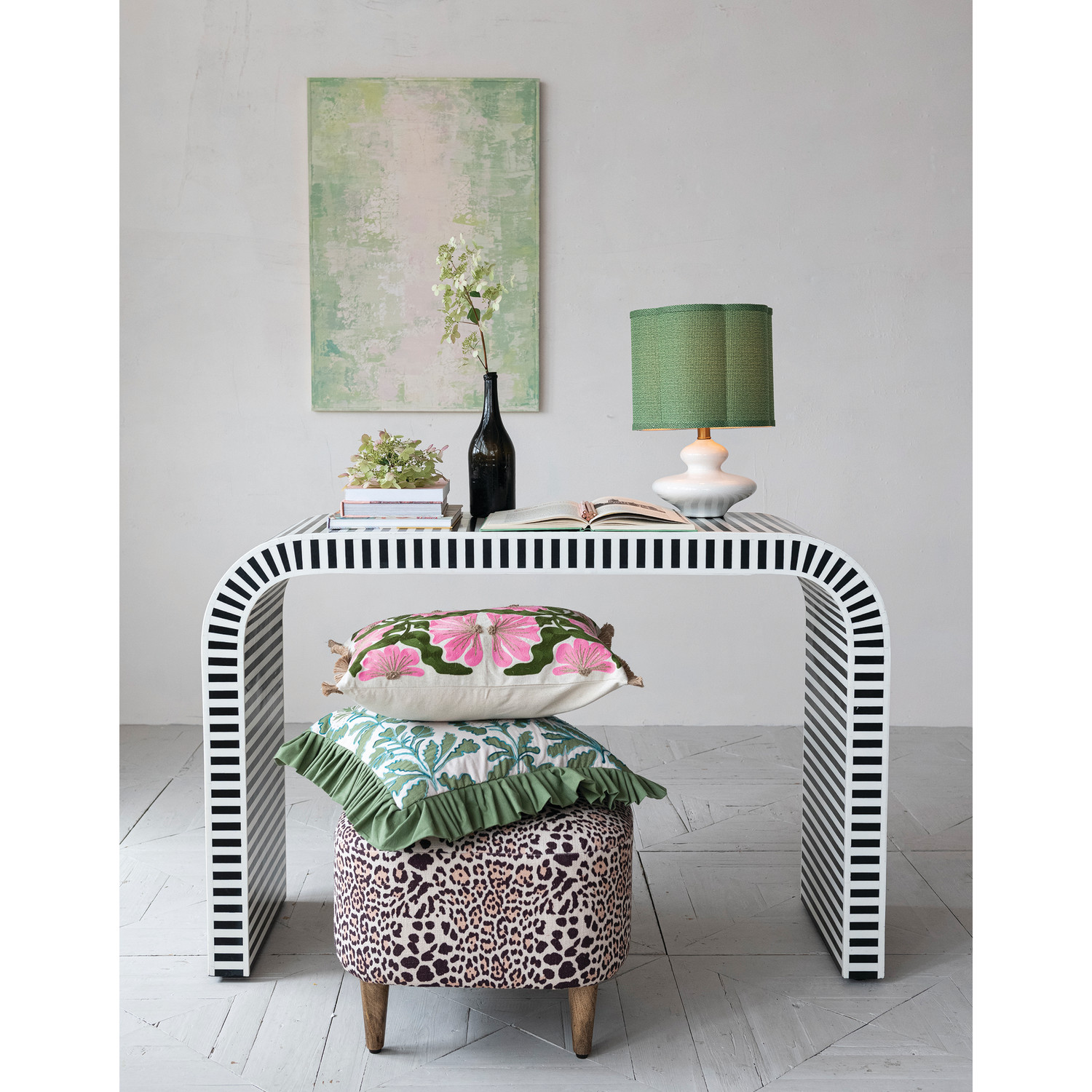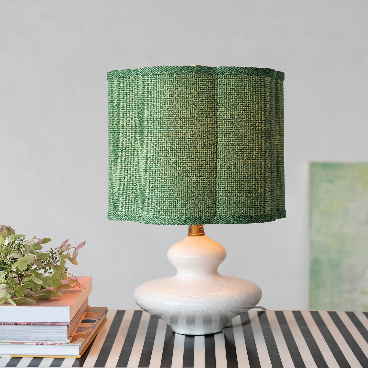 Stoneware Table Lamp with Scalloped Green Fabric Shade, White