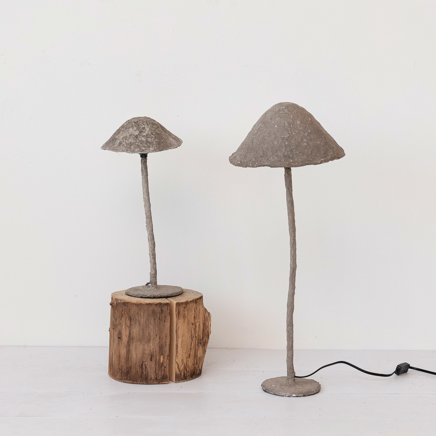 This tall grey handmade paper mâché and metal mushroom table lamp is a charming and cozy addition to any room. Its mushroom-shaped body adds a soft glow and sophistication, while the metal stem and base add stability. This lamp is suitable for various room styles, from farmhouse to boho, French country to Scandinavian, and modern to round. It requires a 25W bulb and comes with an inline switch for easy on/off. Made from eco-friendly materials, it measures 11 inches in diameter and 30 inches in height. The lamp is easy to clean. This table lamp is a fun and quirky accessory that will enhance any room style and ambiance.