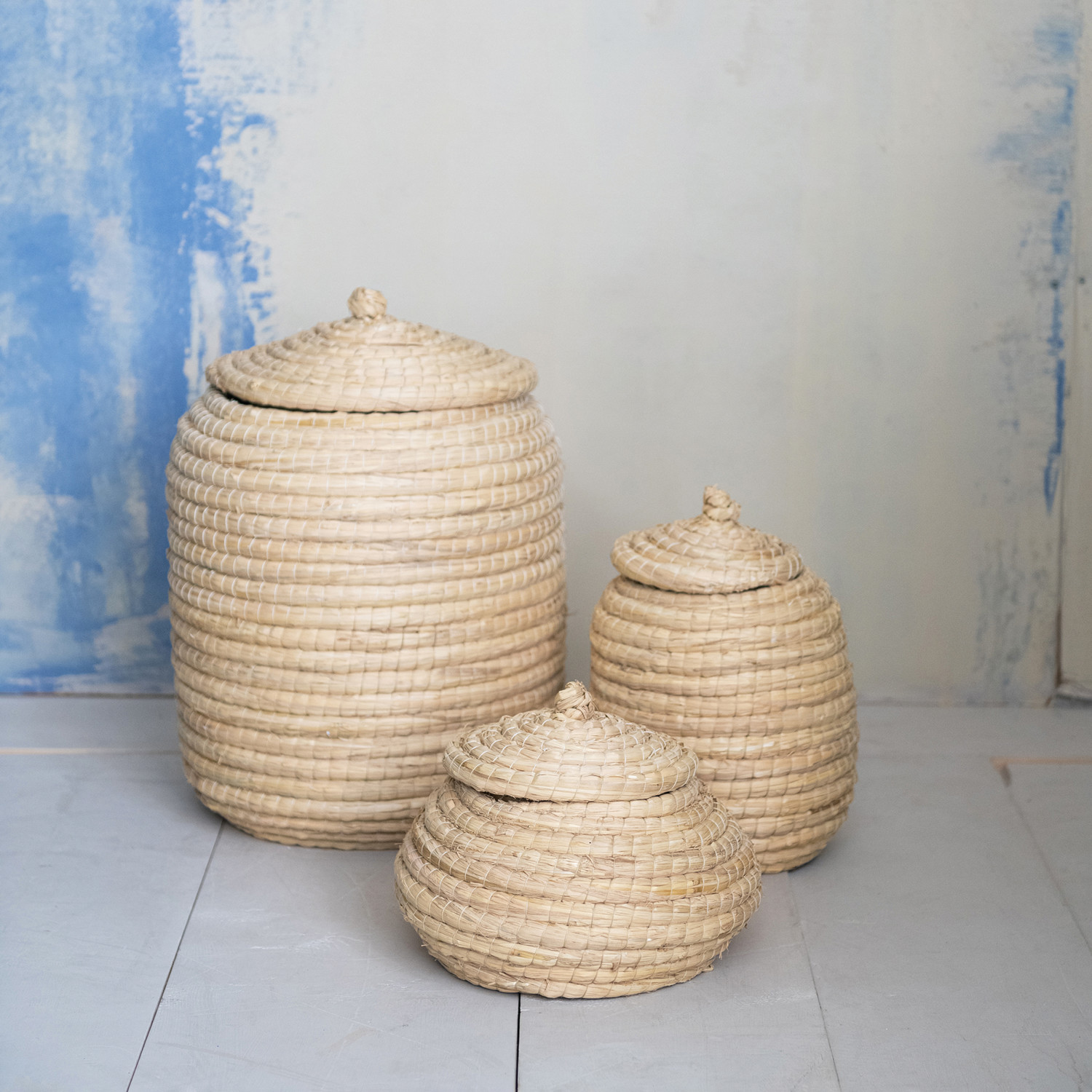 Hand-Woven Straw Baskets with Lids, Natural, Set of 2