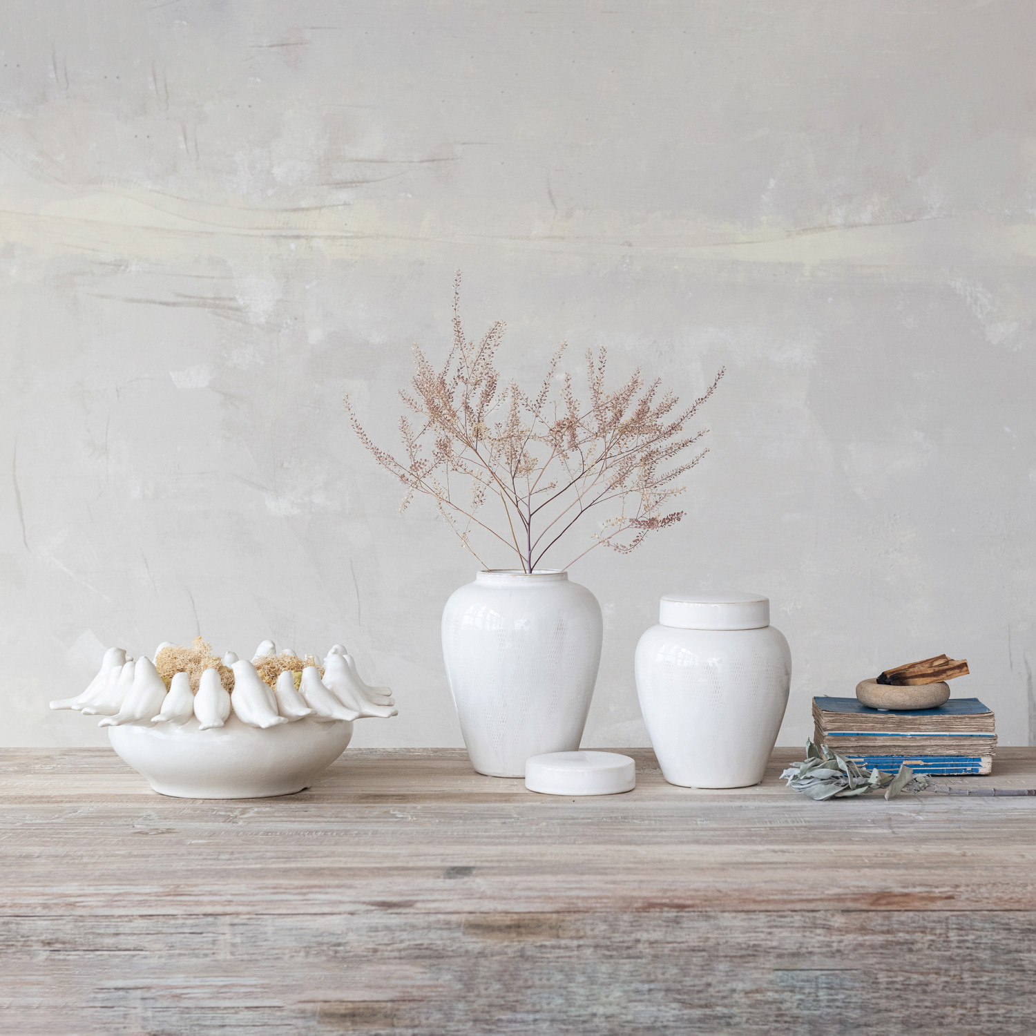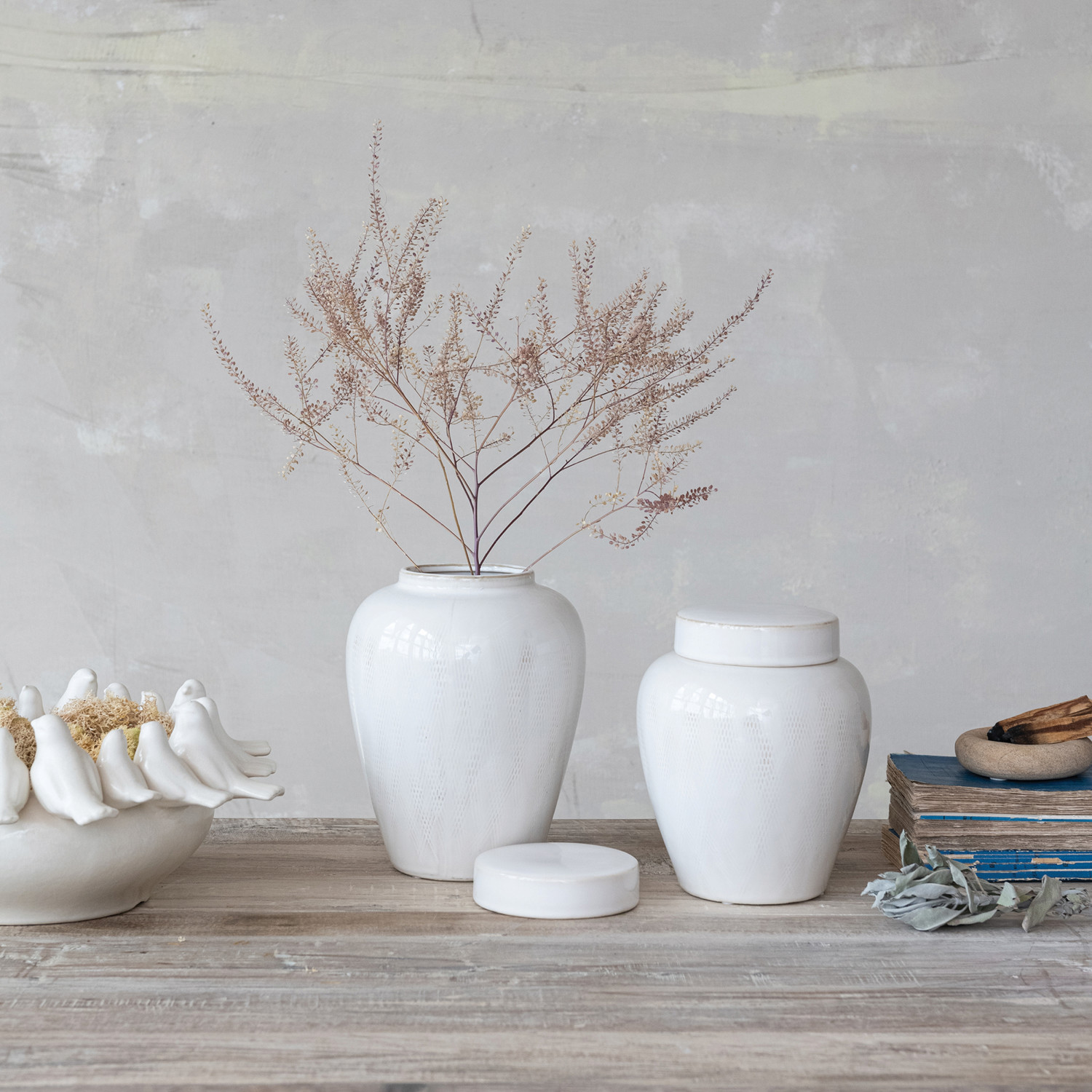 Catalog Name: 7" Round x 9-1/2"H Decorative Debossed Stoneware Ginger Jar w/ Linen Texture & Lid, Reactive Glaze, White (Each One Will Vary)