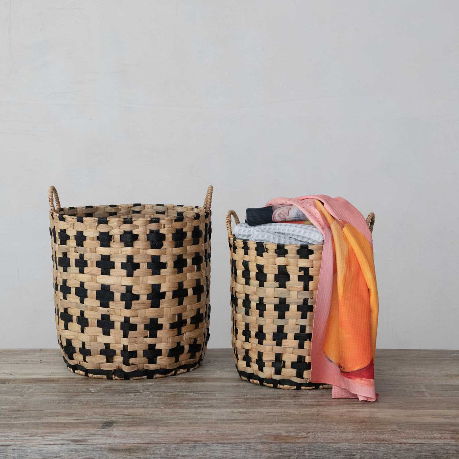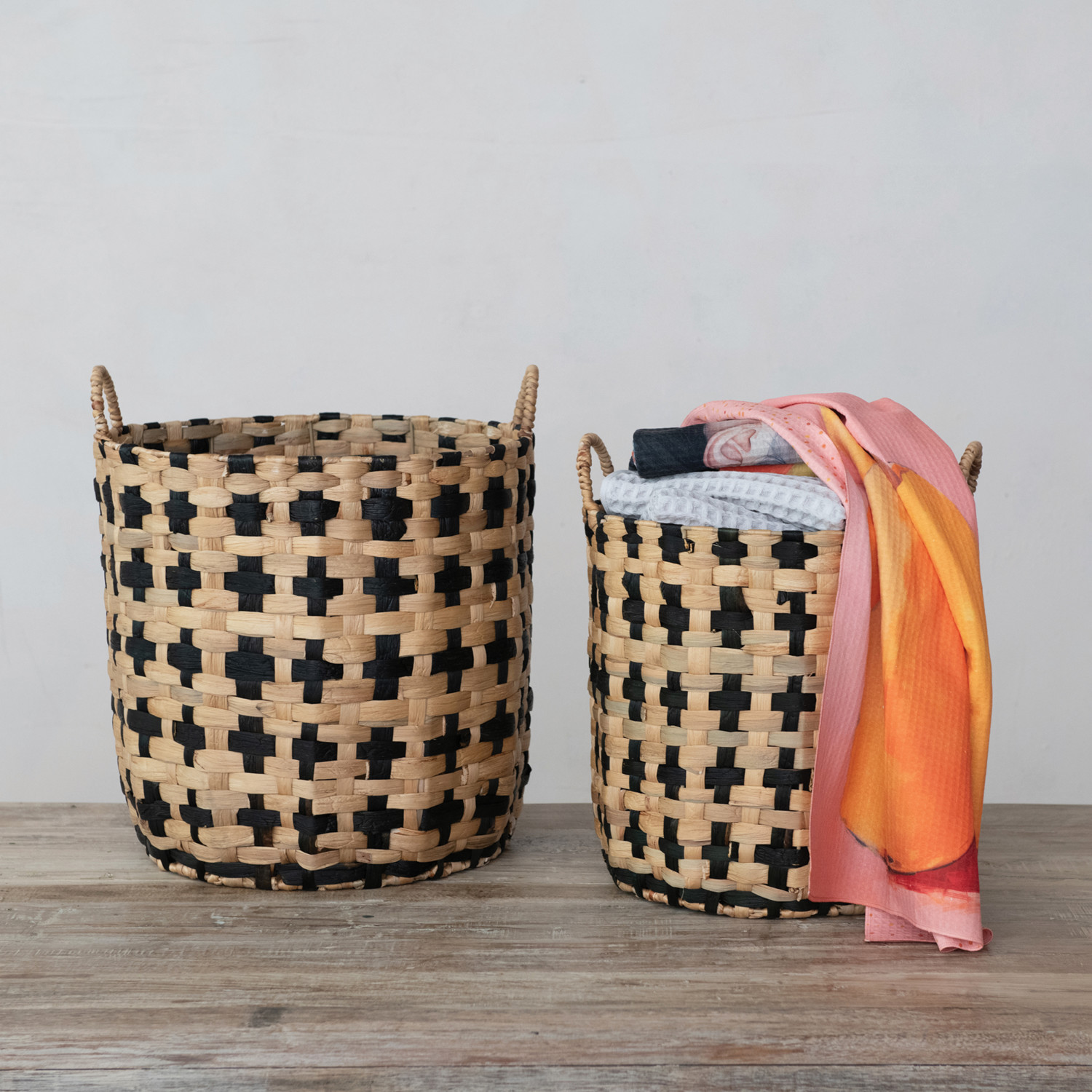 Woven Water Hyacinth Baskets w/ Handles, Natural & Black, Set of 2