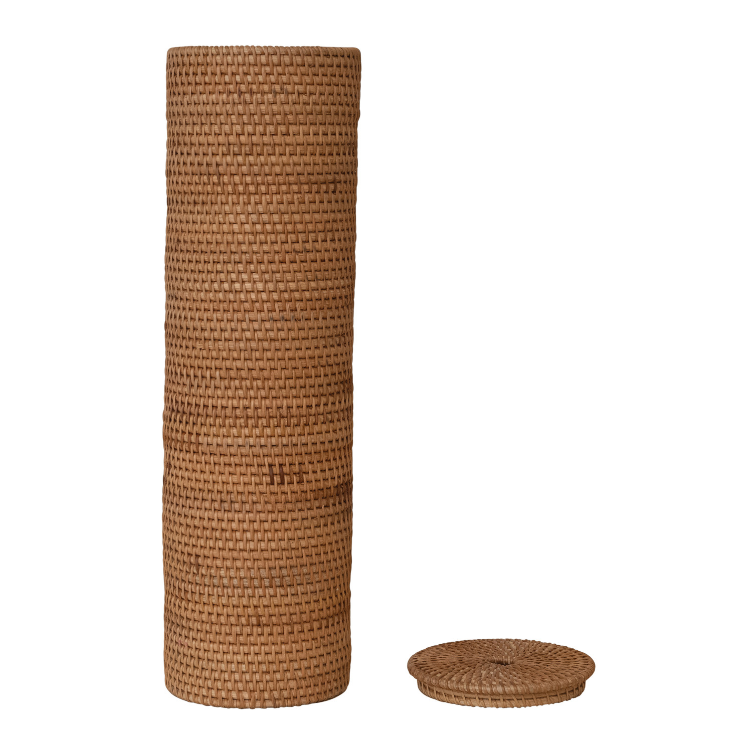 Catalog Name: 5-3/4" Round x 19-1/2"H Woven Rattan Toilet Paper Roll Storage w/ Lid, Natural (Holds 4 Rolls of Toilet Paper)