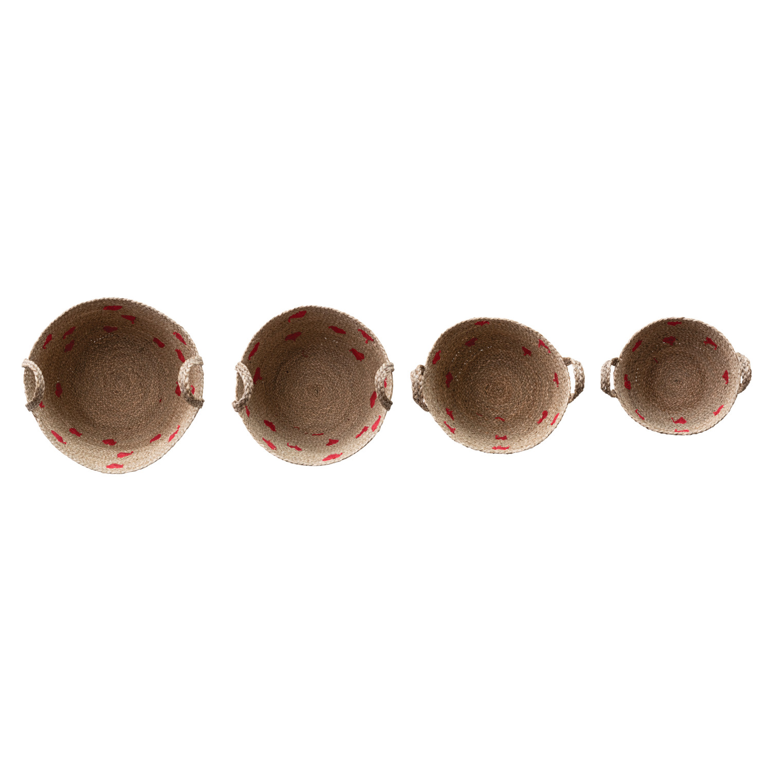Catalog Name: 15-3/4" Round x 13-3/4"H, 13-3/4" Round x 12"H, 12" Round x 10"H & 10" Round x 8"H Hand-Woven Seagrass Baskets w/ Embroidered Hearts & Handles, Natural & Red, Set of 4