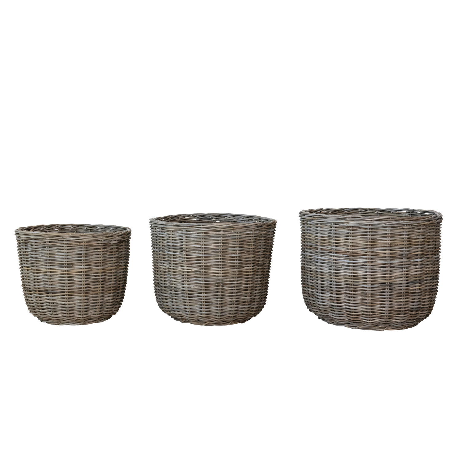 Catalog Name: 32-1/2" Round x 25-1/2"H, 29-1/2" Round x 23-1/2"H & 26-1/2" Round x 21-1/2"H Hand-Woven Rattan Baskets, Grey Washed, Set of 3, Truck Ship