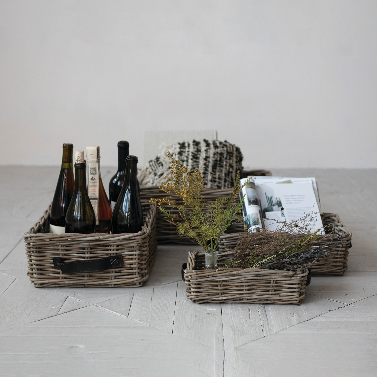 Hand-Woven Rattan Nesting Baskets with Leather Handles, Grey Washed, Set of 4