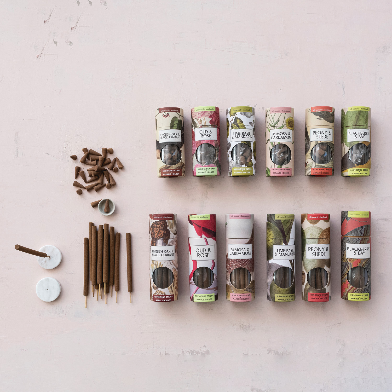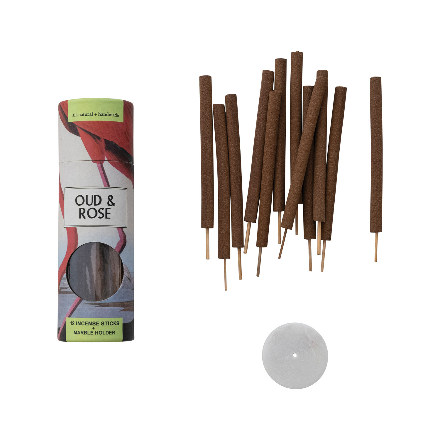 Catalog Name: 6"L 12 Piece All Natural Handmade Oud & Rose Scented Thick Incense Sticks in Printed Tube w/ 2" Round White Marble Incense Holder, Set of 13 (Est. Burn Time 45 Minutes)