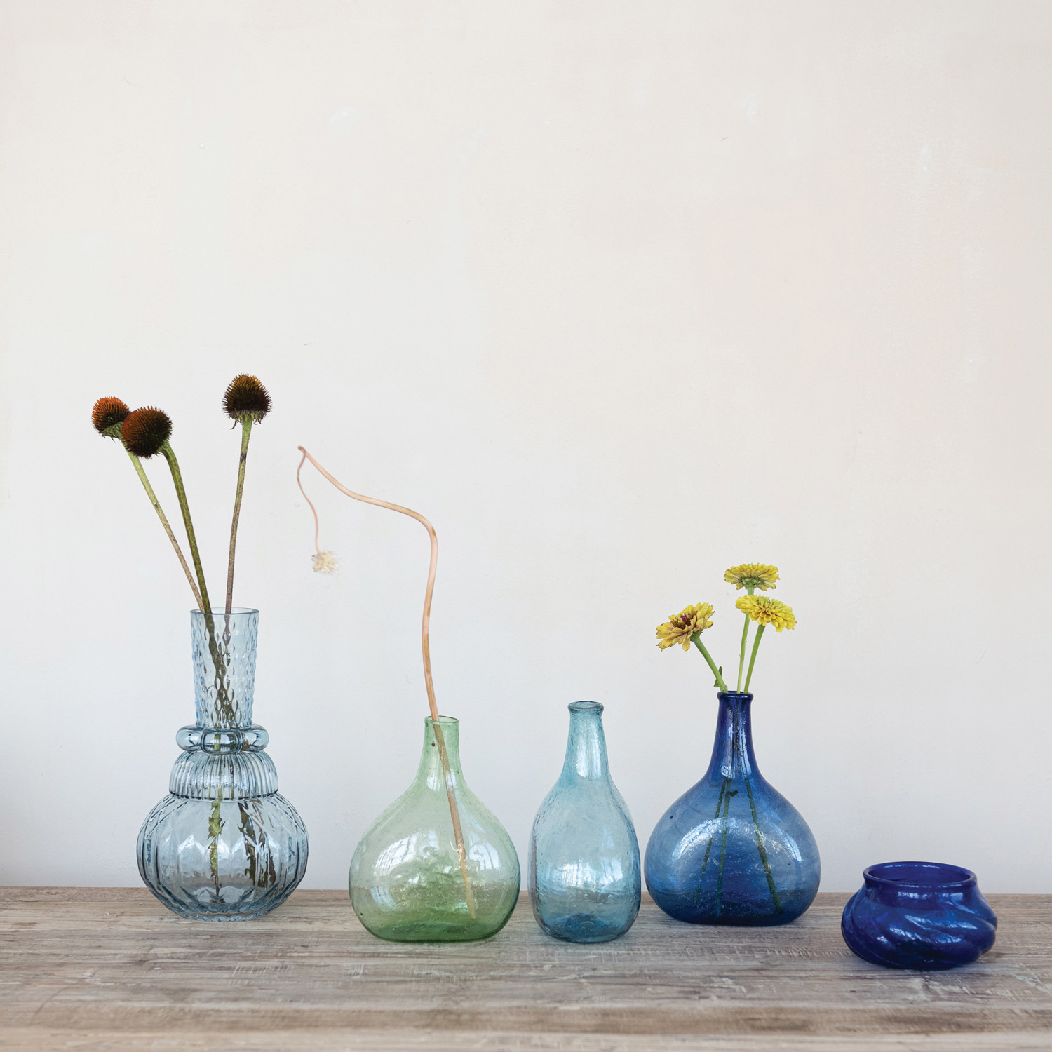 Catalog Name: 5" Round x 3-1/4"H Hand-Blown Seeded Twisted Glass Tealight/Votive Holder, Blue