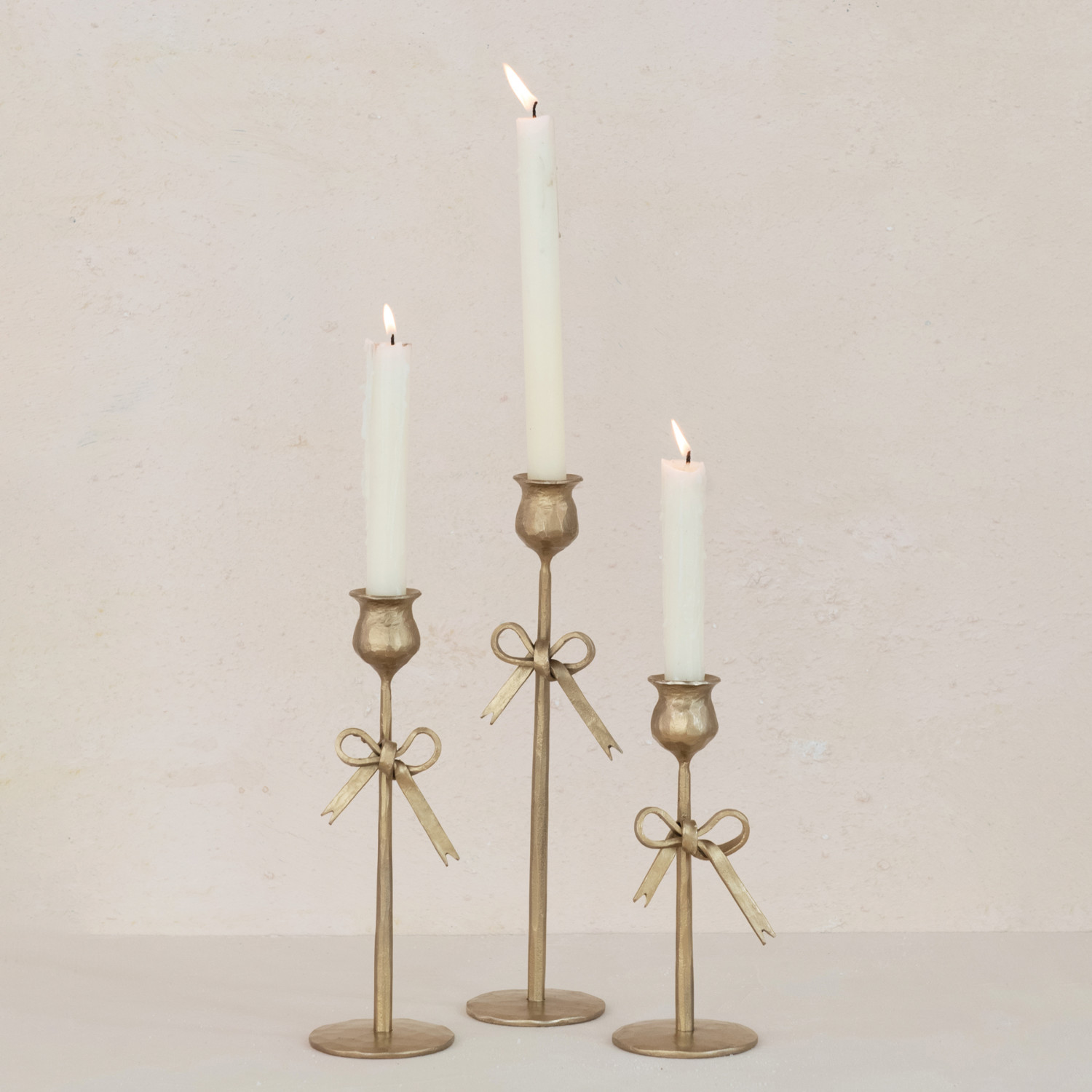 Hand-Forged Iron Taper Holders w/ Bow, Antique Gold Finish, Set of 3