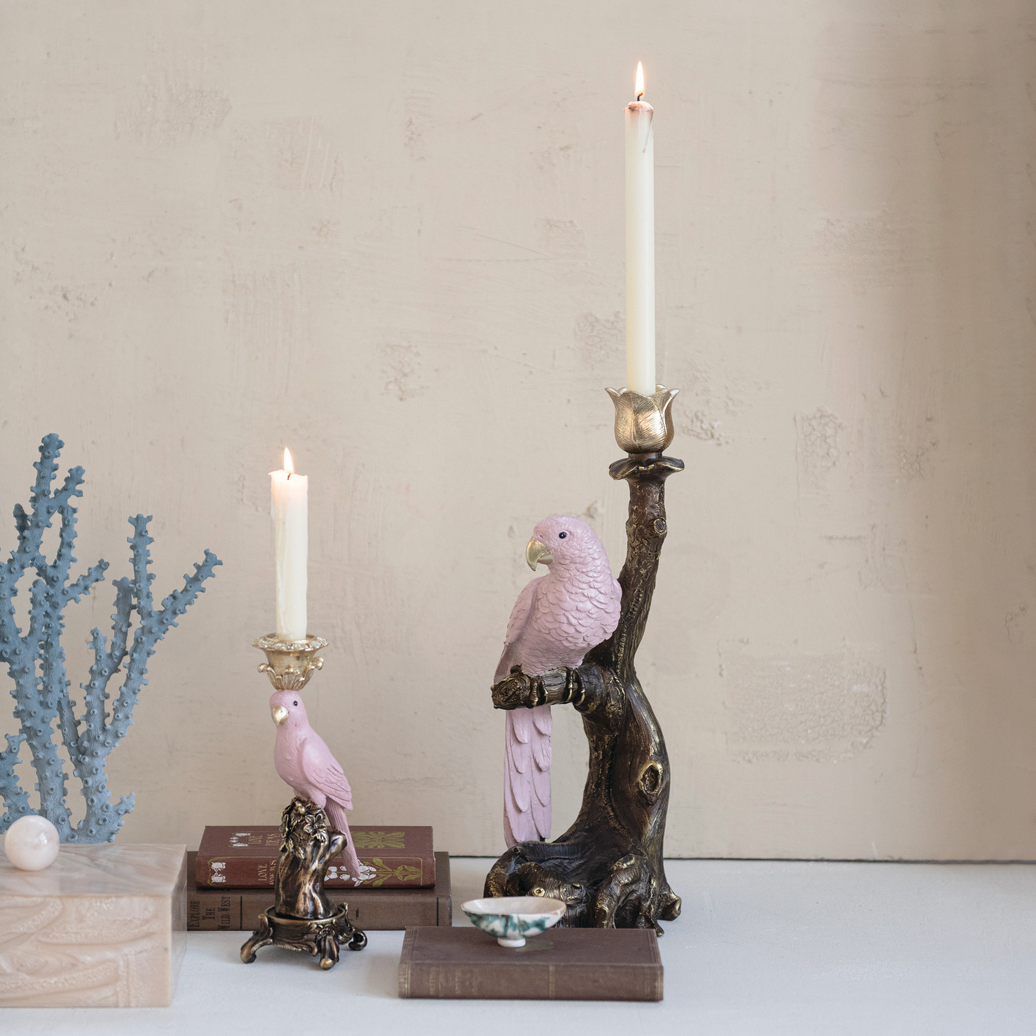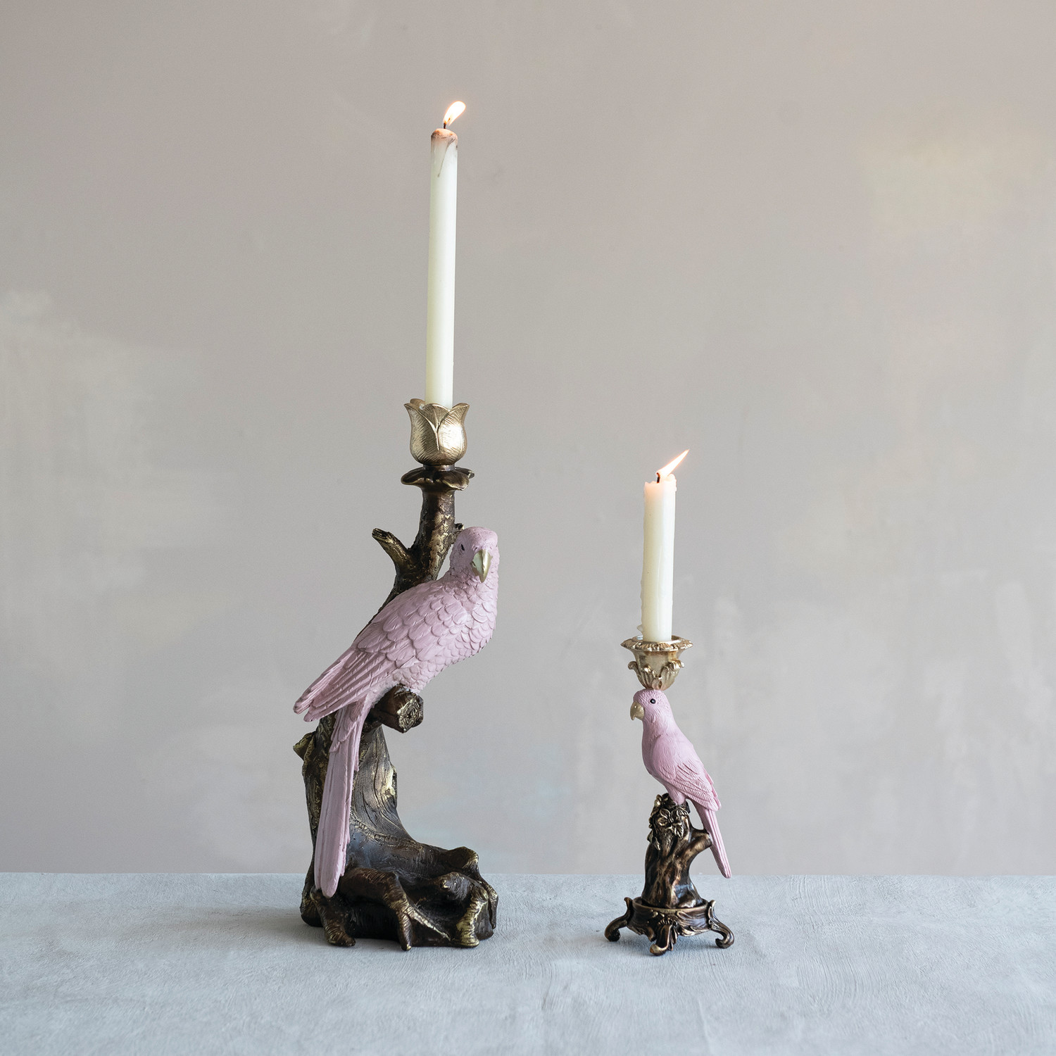 6-1/2"L x 6"W x 16"H Resin Taper Holder with Parrot on Branch, Antique Gold Finish & Pink