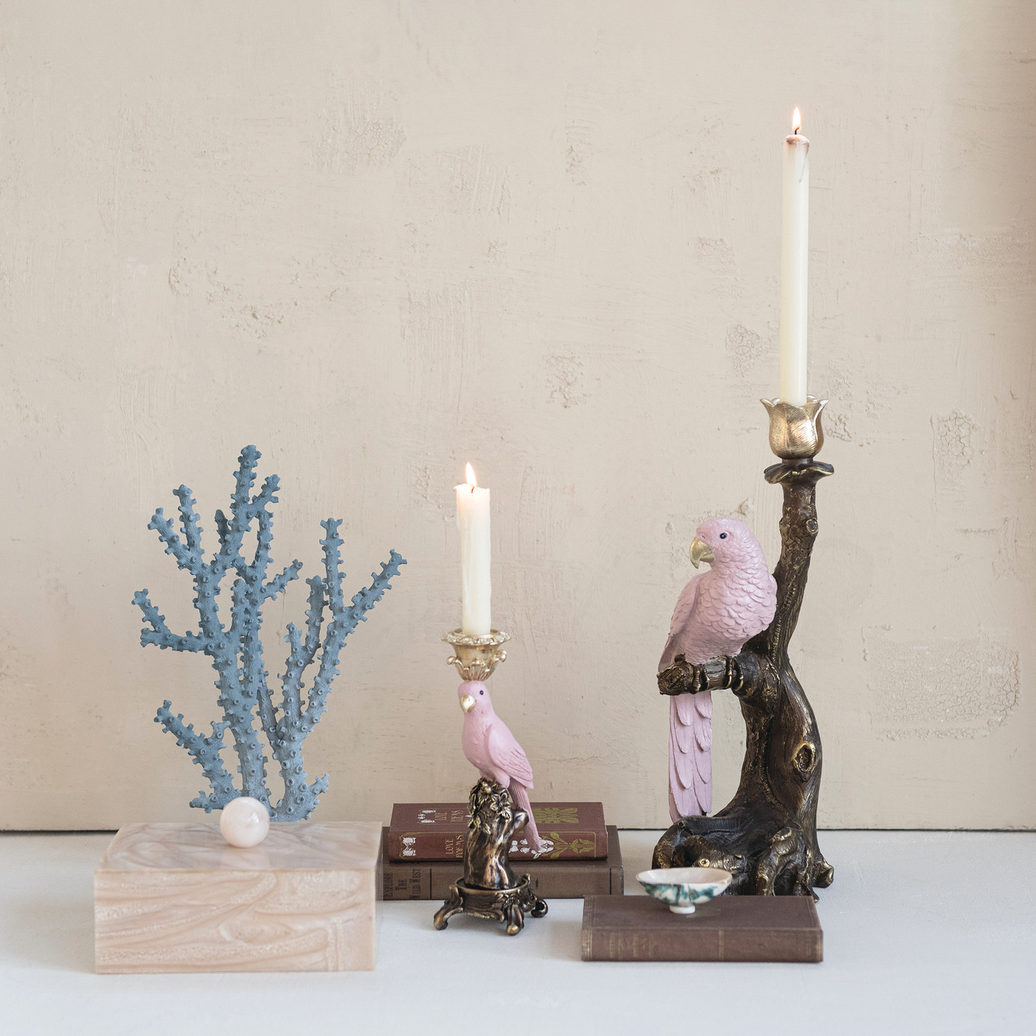 Catalog Name: 6-1/2"L x 6"W x 16"H Resin Taper Holder w/ Parrot on Branch, Antique Gold Finish & Pink