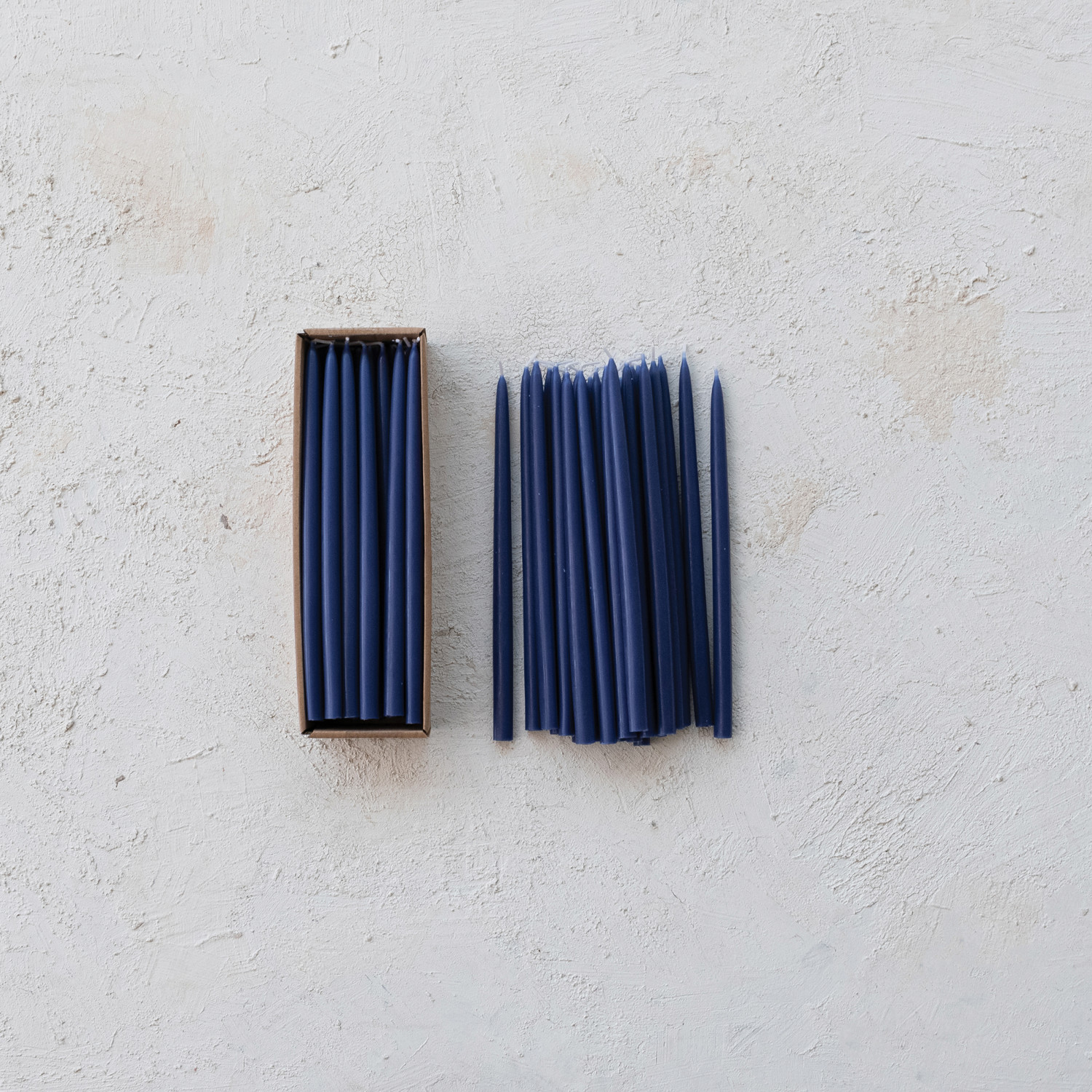 Catalog Name: Approx. 1/2" Round x 10"H Unscented Thin Taper Candles in Box, Navy Color, Set of 24 (Est. Burn Time 3 Hours)