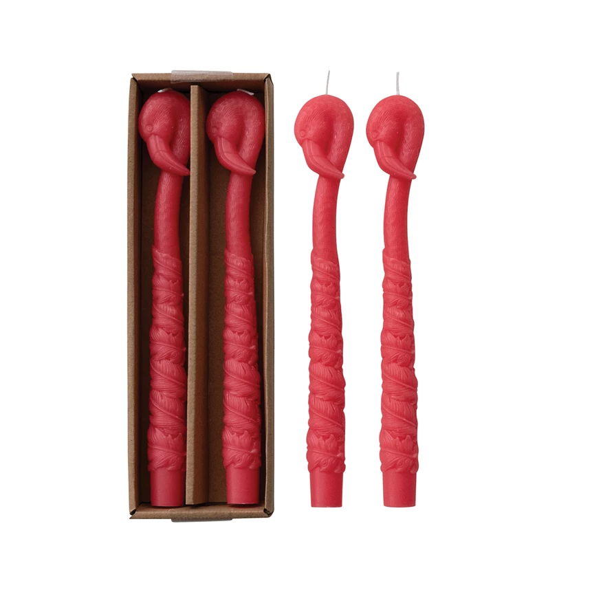 Catalog Name: 10"H Unscented Flamingo Shaped Taper Candles in Box, Fuchsia Color, Set of 2 (Est. Burn Time 8 Hours)