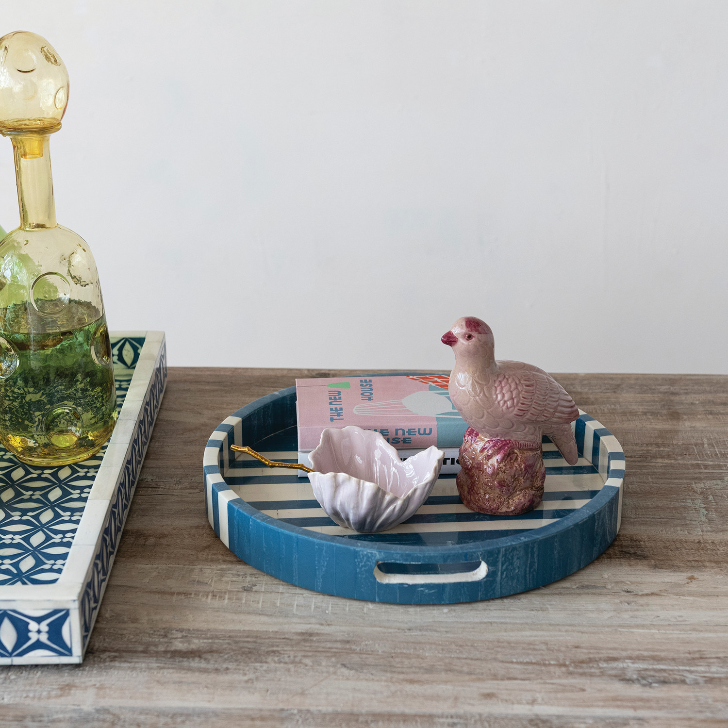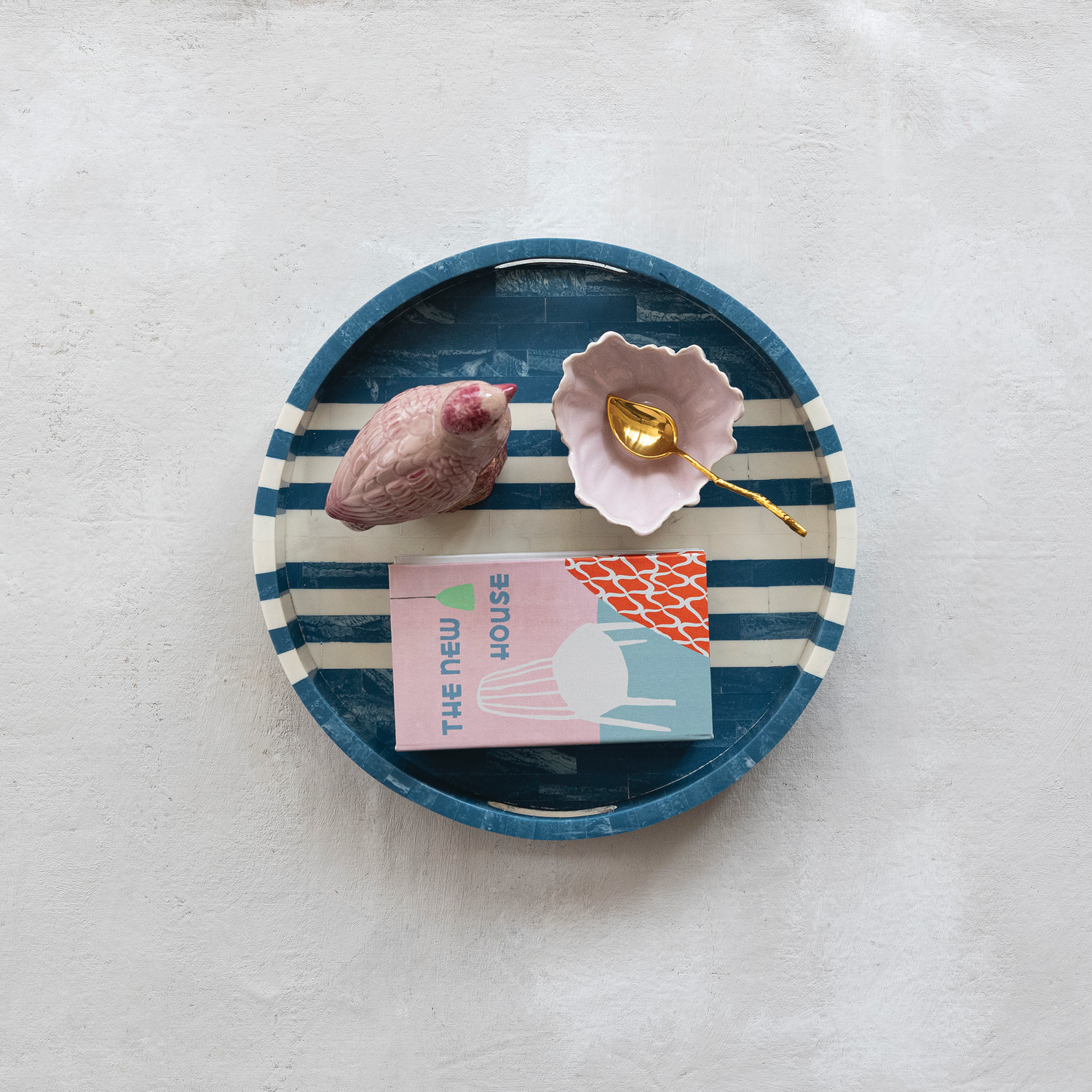 Catalog Name: 16" Round Decorative Inlaid Marbled Resin & MDF Tray w/ Stripes & Handles, Blue & White (Each One Will Vary)