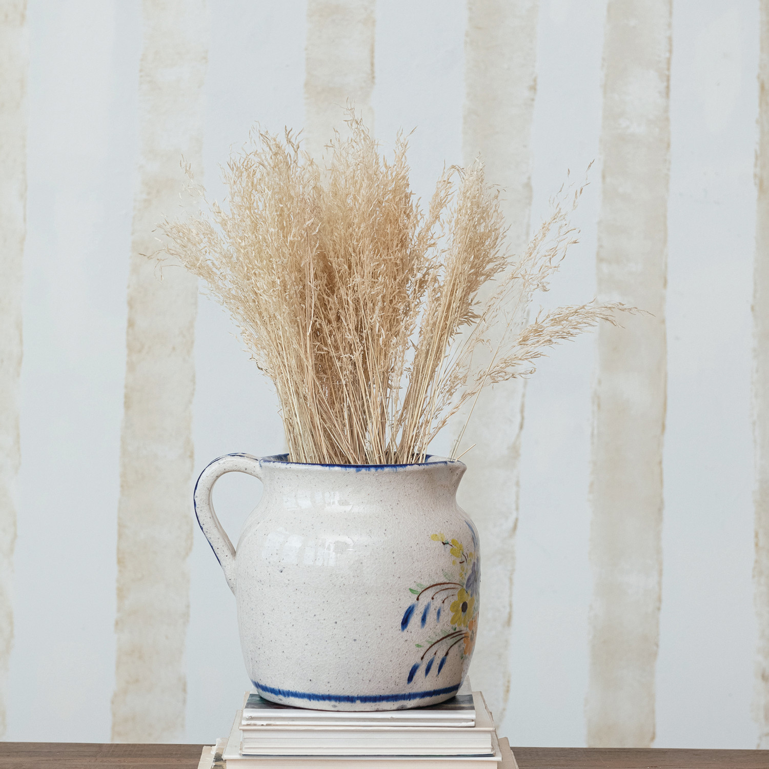 This Decorative Terra-Cotta Pitcher captures the essence of a countryside retreat with its handcrafted appearance and delicate floral accents. The crackle glaze finish in a variety of colors, adds depth and character, ensuring that each pitcher has its own distinct personality. Its oval shape and sturdy handle make it a functional piece for serving or a captivating display item. The design draws inspiration from various rustic styles, making it a fitting addition to spaces that celebrate the beauty of nature and traditional craftsmanship. Measures 10.75 inches in length, 9 inches in width, and 8.5 inches in height, making it a prominent decorative piece with practical appeal. Whether used for serving refreshments or as a vase for blooms, this pitcher brings a touch of artisanal charm to any setting.