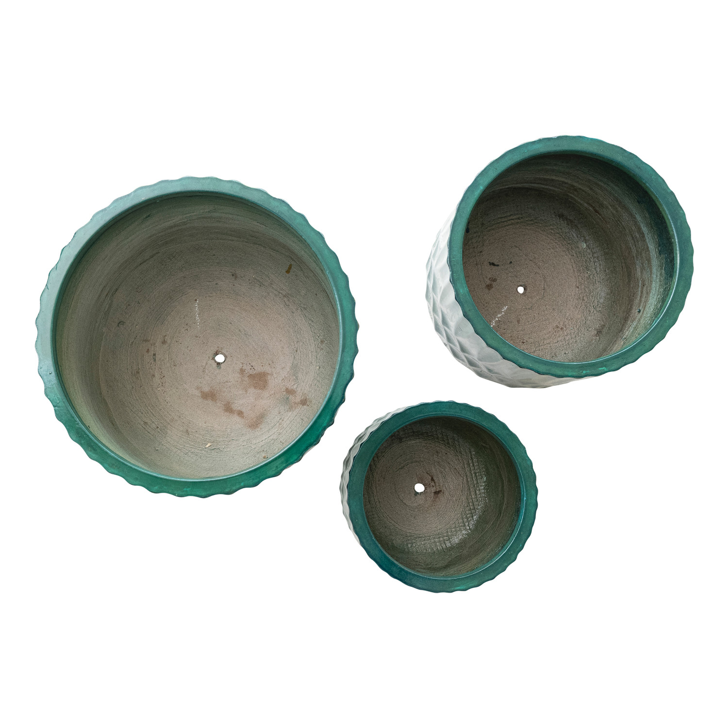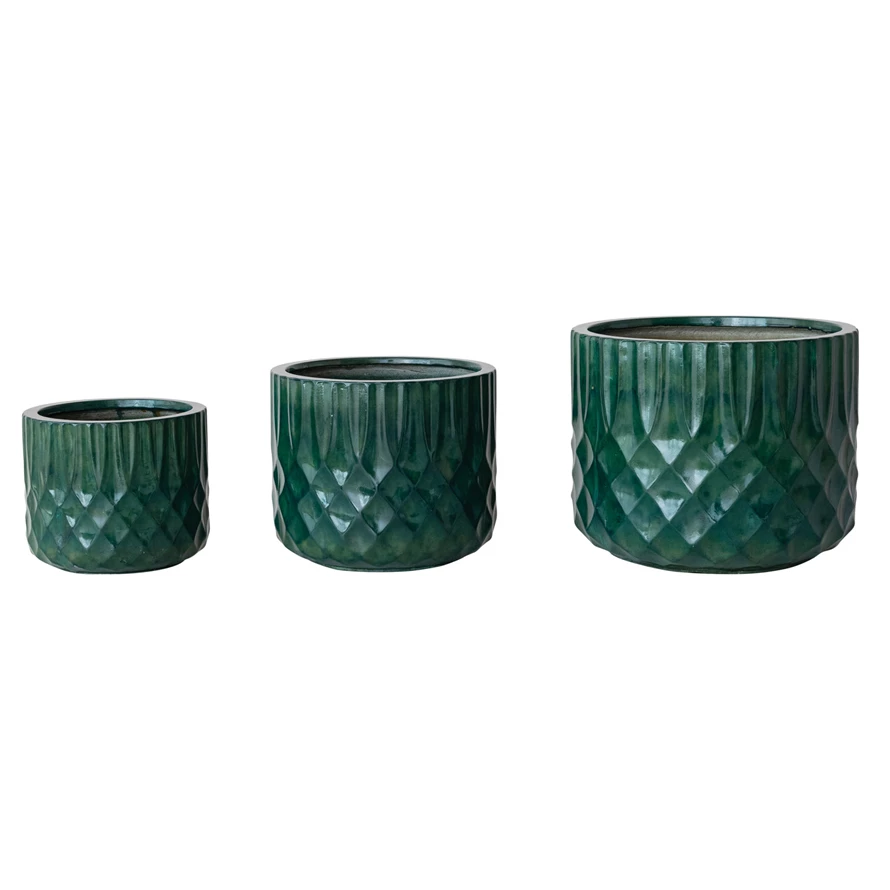 Catalog Name: 14-3/4" Round x 12"H, 12" Round x 10"H & 9-1/2" Round x 8"H Embossed Lightweight Shatter-Resistant Indoor/Outdoor Planters w/ Drainage Holes, Green, Set of 3 (Holds 12", 10" & 8" Pots)