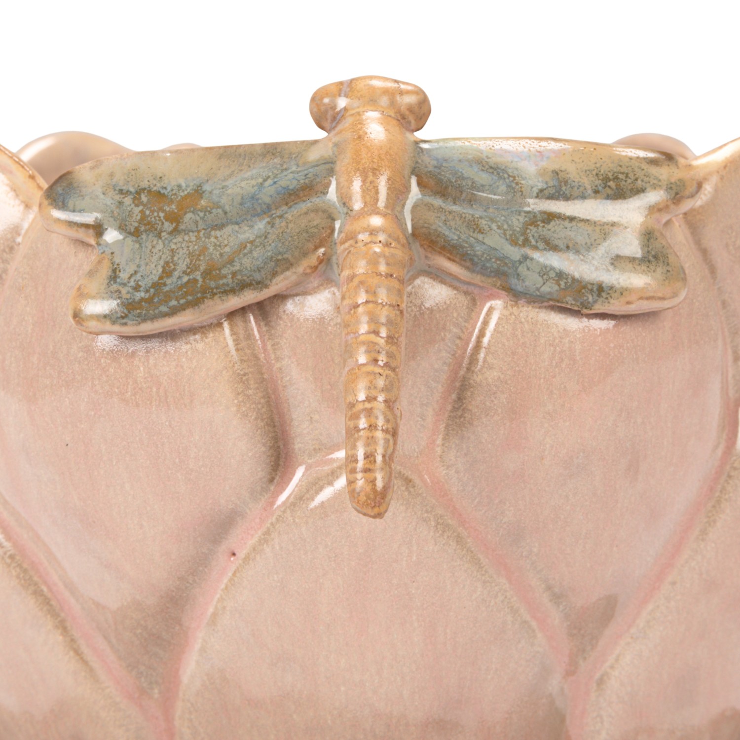 Catalog Name: 7-1/4" Round x 5-1/4"H Stoneware Flower Shaped Planter w/ 3D Dragonfly & Lilypad Shaped Saucer, Reactive Glaze, Multi Color, Set of 2 (Holds 4" Pot) (Each One Will Vary)
