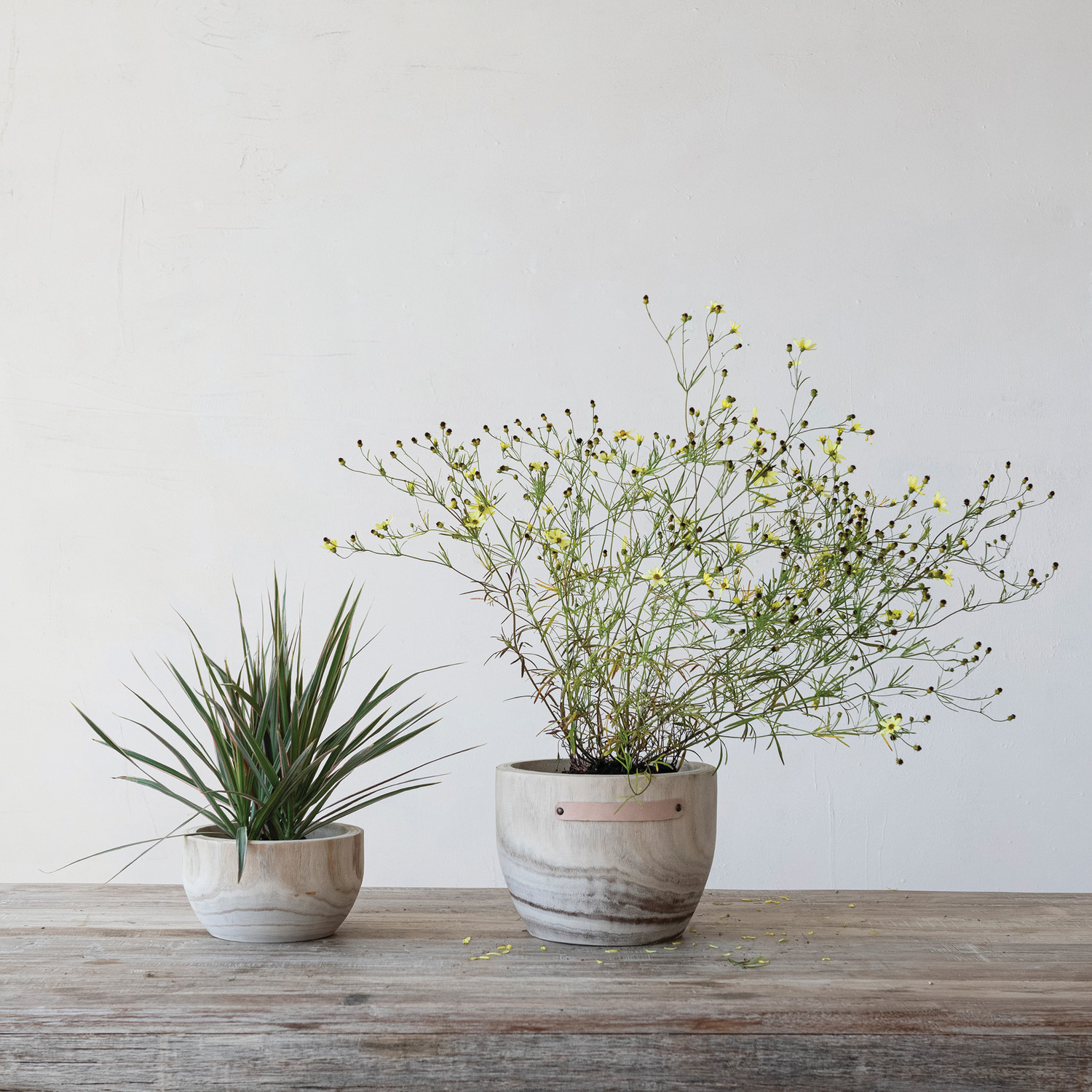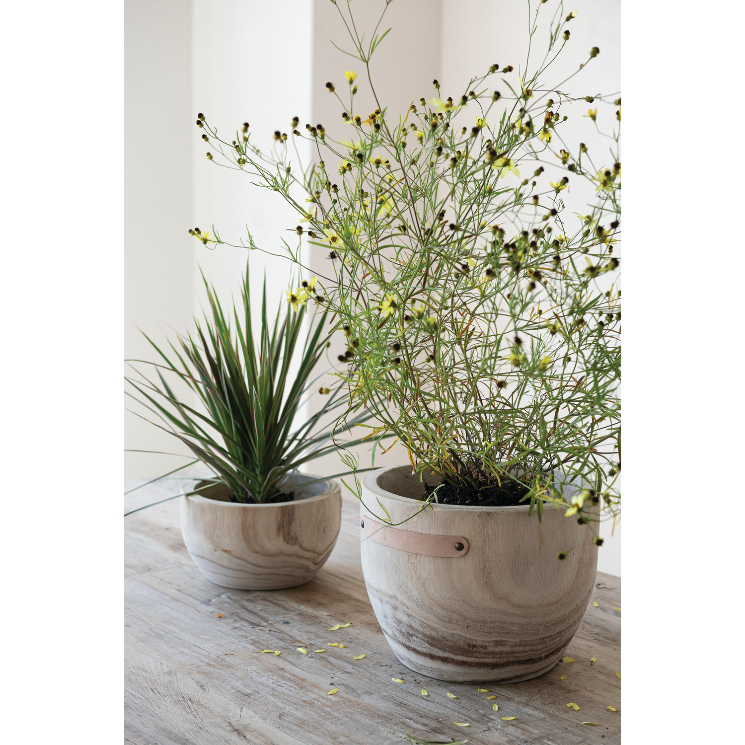 Decorative Paulownia Wood Nested Planters with Leather Tabs, Natural, Set of 2