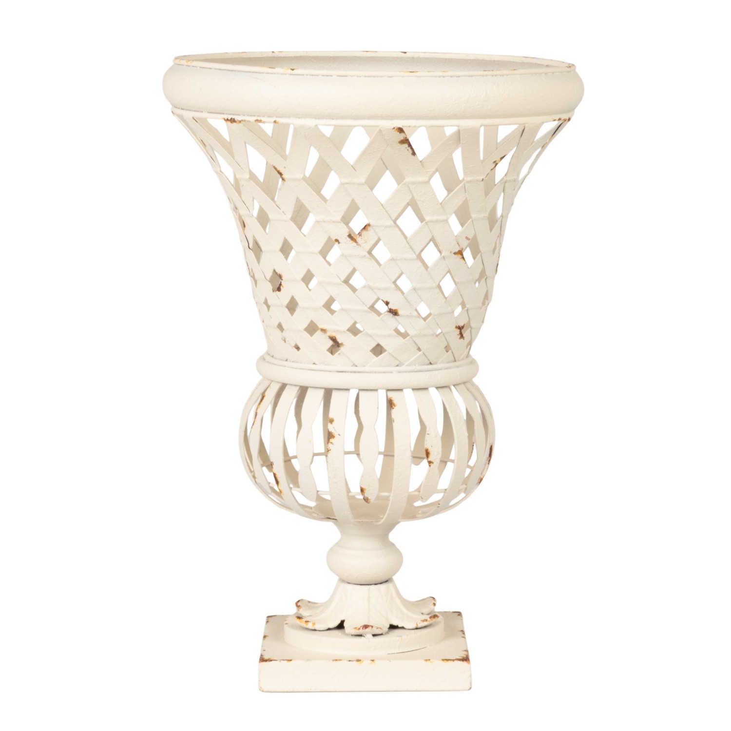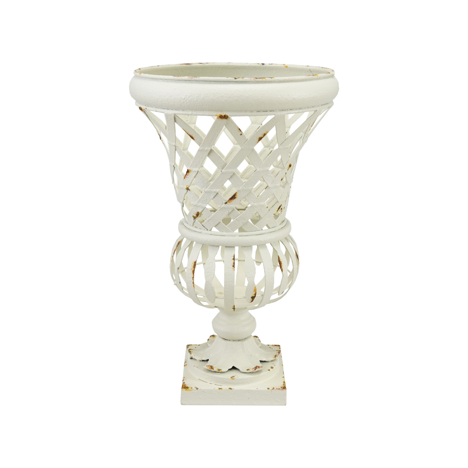 Catalog Name: 11" Round x 16-1/2"H Woven Metal Footed Urn, Distressed Finish, White