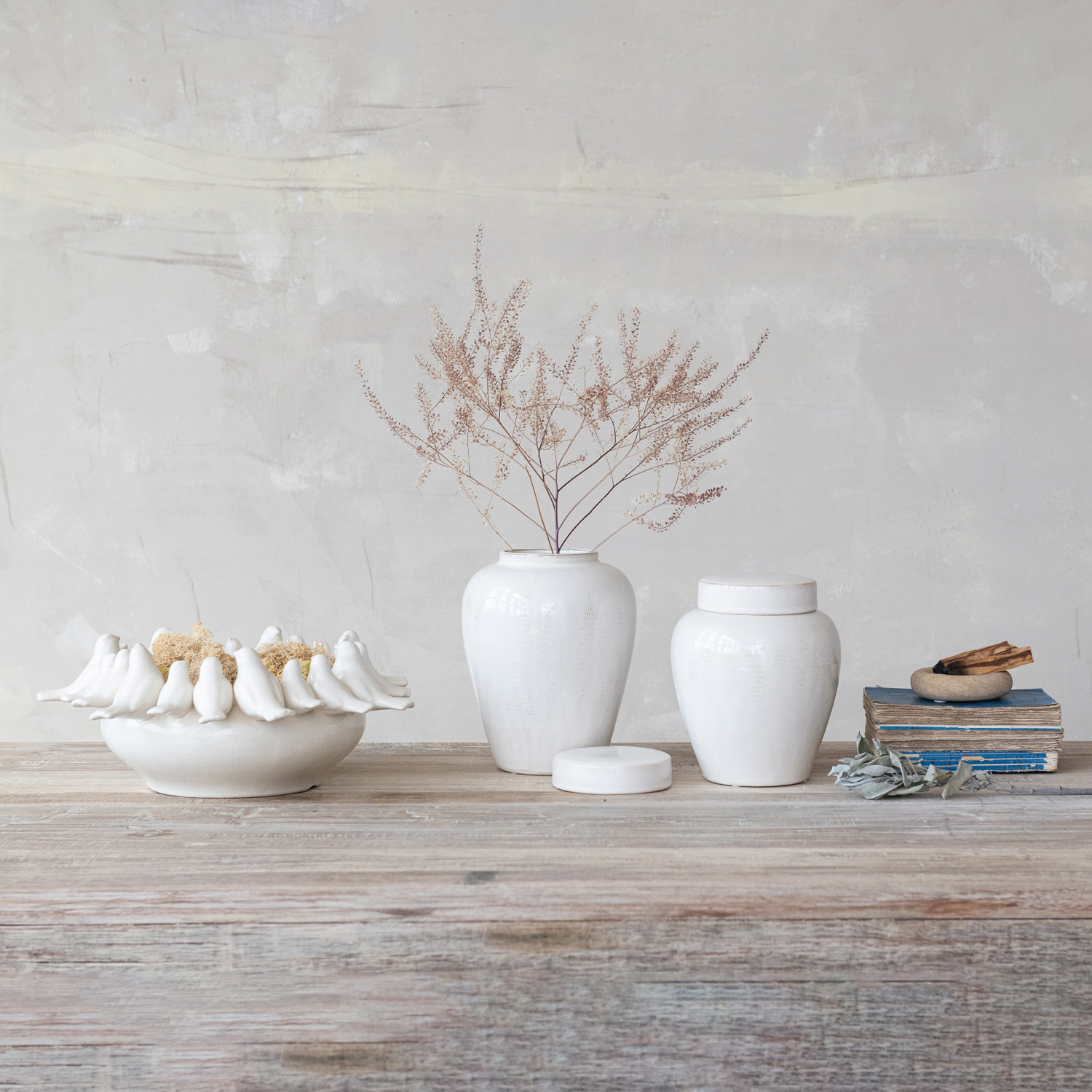 Decorative Stoneware Bowl/Planter with 3D Birds on Rim, White