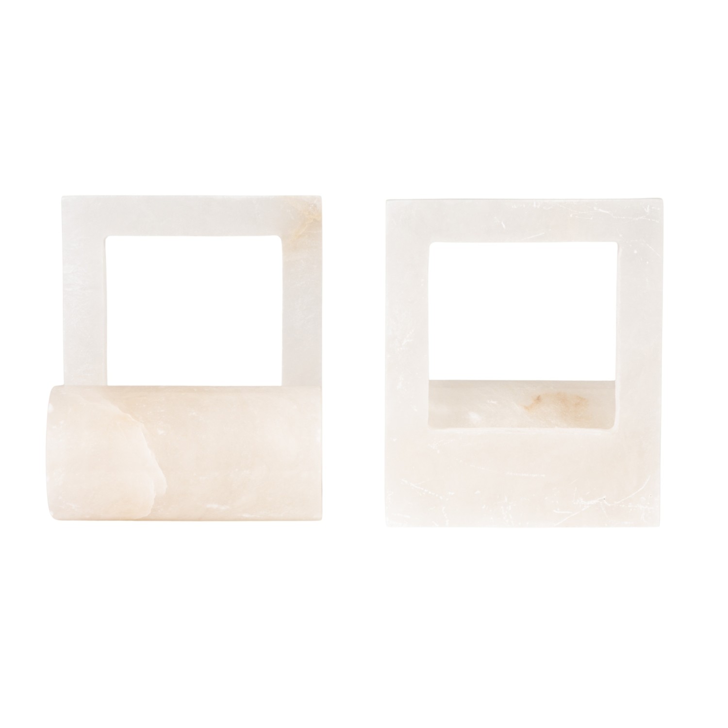 Catalog Name: 5"L x 3-1/4"W x 6"H Alabaster Bookends w/ Cut-Outs, Translucent White, Set of 2 (Each One Will Vary)