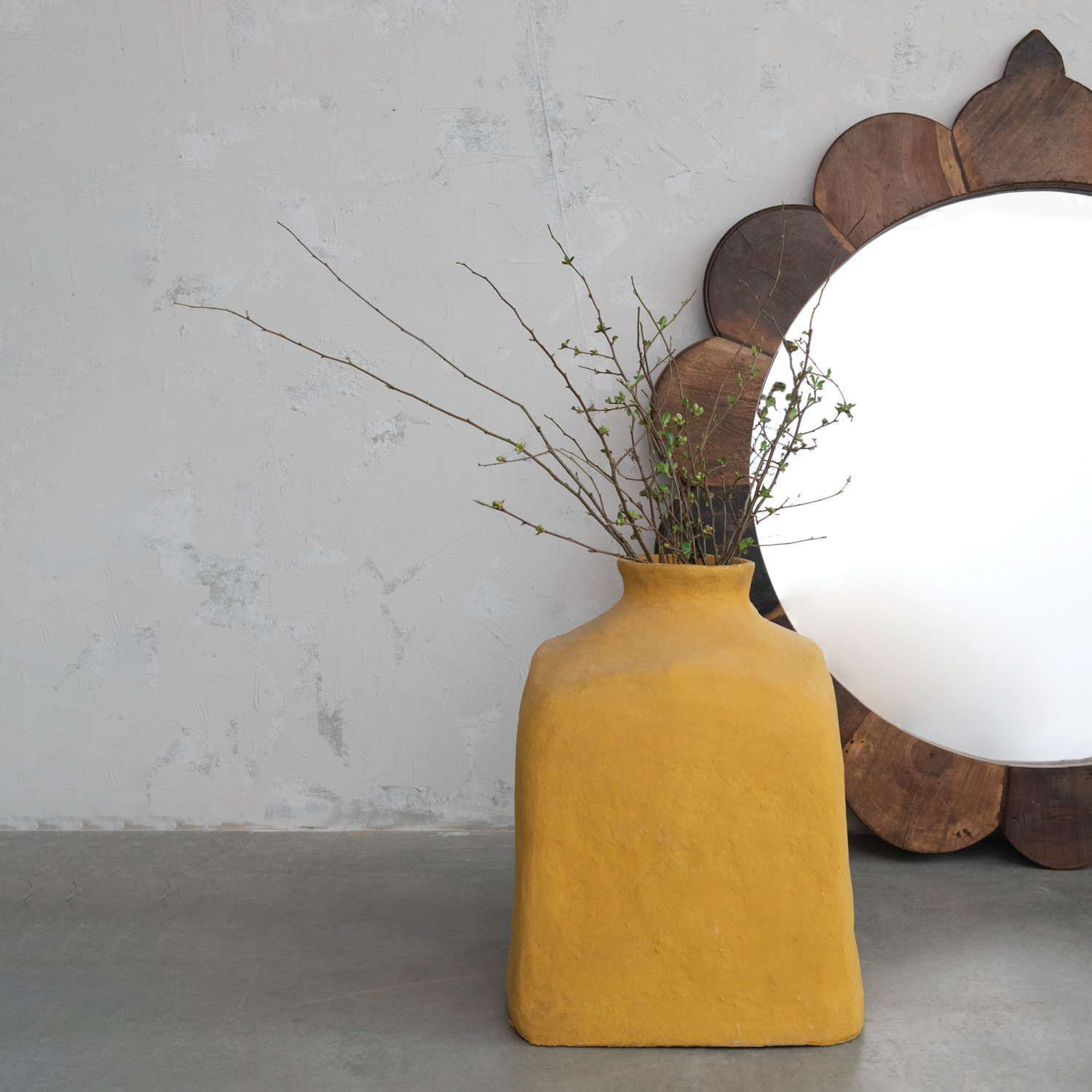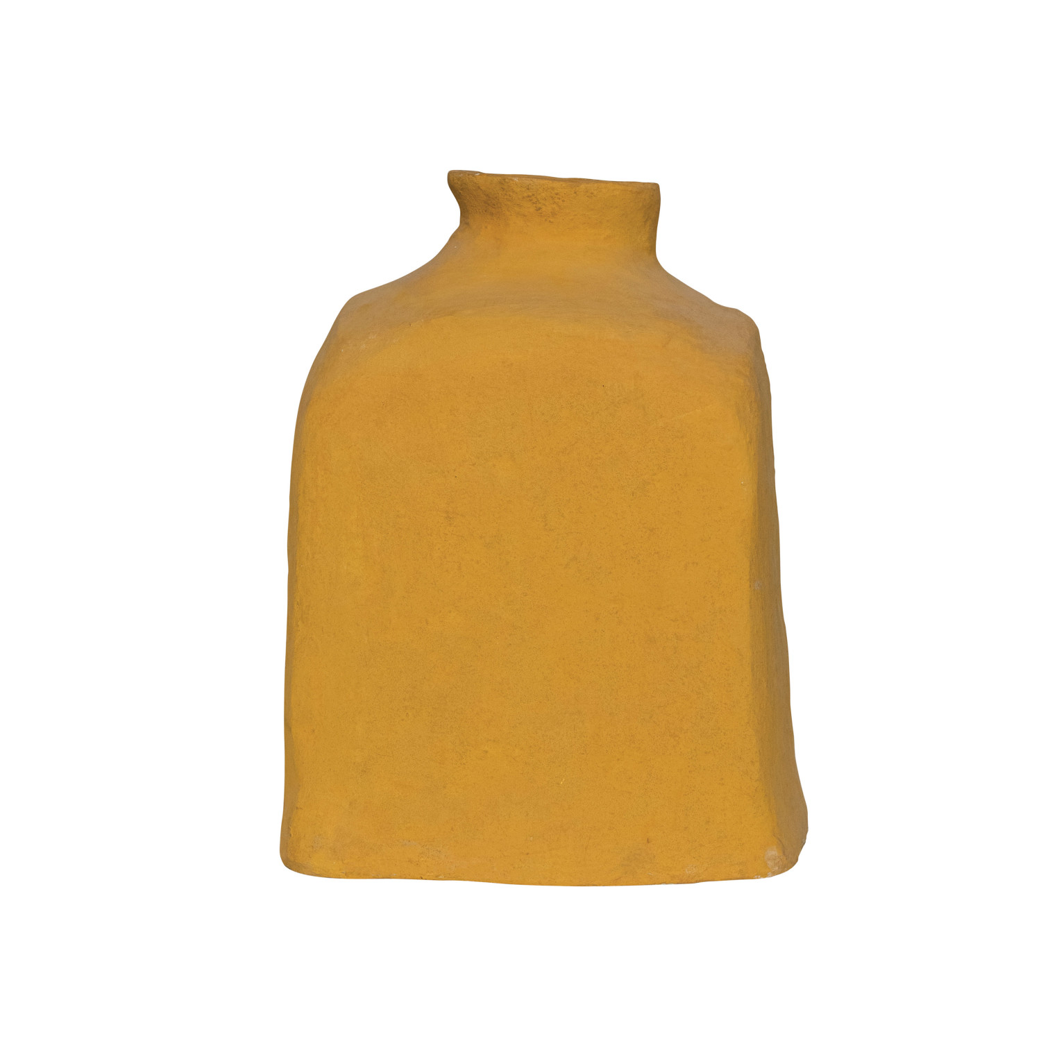 Add some style and personality to any home or office with these stunning vases. These vases come in various shapes, sizes, materials, and designs, offering a wide range of options to suit any preference and decor. Whether looking for a simple and elegant ceramic vase, a colorful and whimsical glass vase, a rustic and natural wood vase, or a modern and sleek metal vase, there is something for everyone in this collection. These vases are perfect for displaying flowers, plants, candles, or other decorative items, or simply as standalone accents that will enhance the beauty and charm of any space. Featuring a square shape and mustard color and texture from paper Mache, this floor vase stands tall at 21 inches and adds elegance and artistic flair to any room with its individual variations. Its bold and vibrant mustard color adds a pop of personality and warmth to any space making it the perfect complement to homes with eclectic, modern, or bohemian decor styles. The wide 7-inch round opening provides ample space to create stunning floral arrangements or showcase tall decorative branches, while its lightweight design allows for easy repositioning, giving anyone the flexibility to create different focal points in any home. Made of paper Mache.