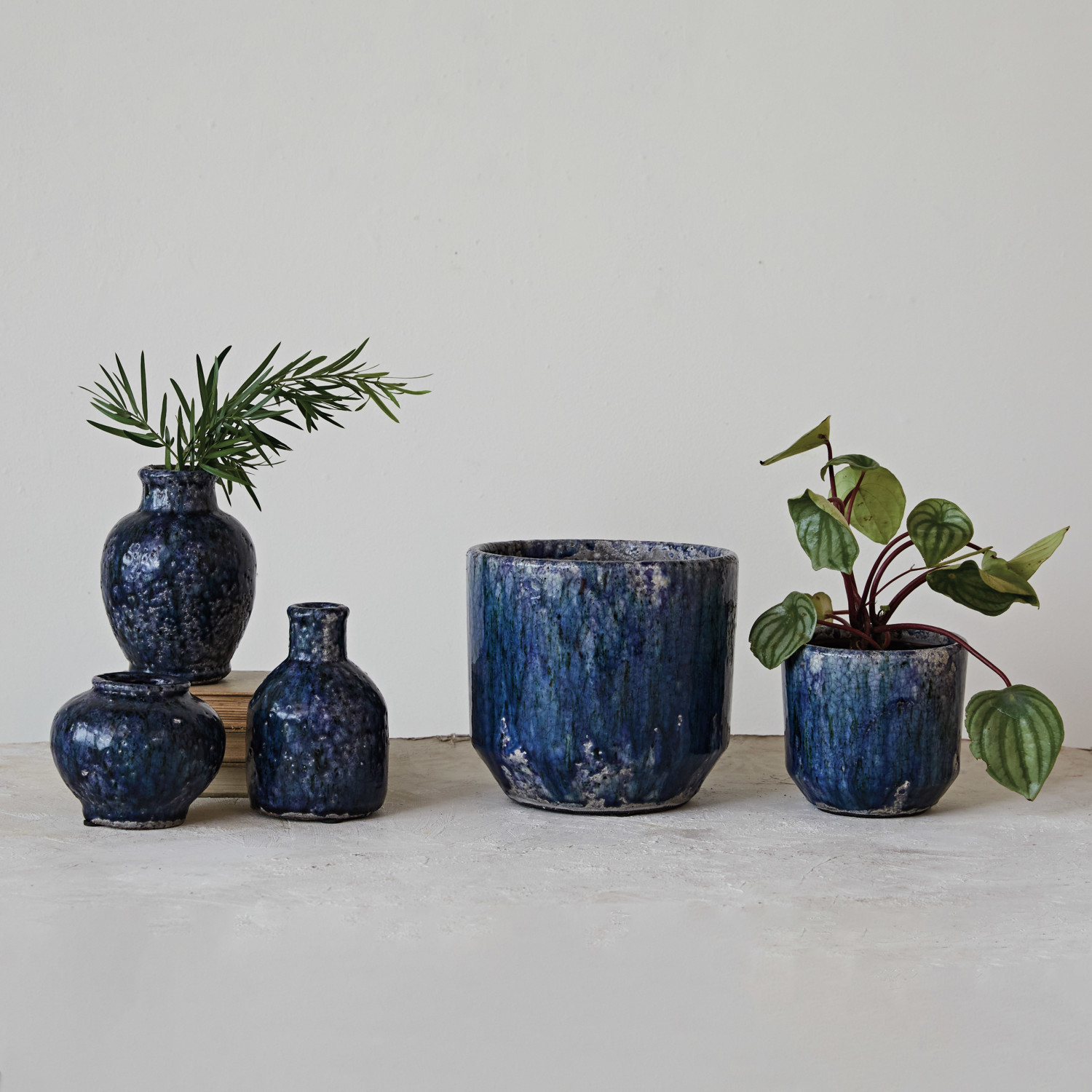 This set of decorative terra-cotta vases with a crackle glaze and navy color is a unique and beautiful addition to any home. The vases have a round shape and narrow opening, with a cracked and glossy surface created by the crackle glaze. The navy color gives the vases a vibrant and elegant look. They can be used to display flowers, plants, or branches, or as decorative accents. Place them on tables, shelves, mantels, or windowsills, and create a cozy and inviting atmosphere in the home. These vases are suitable for coastal, beach, garden, French country, or farmhouse styles, adding elegance and charm to any space. Each vase will vary slightly in color and texture due to the crackle glaze process.
