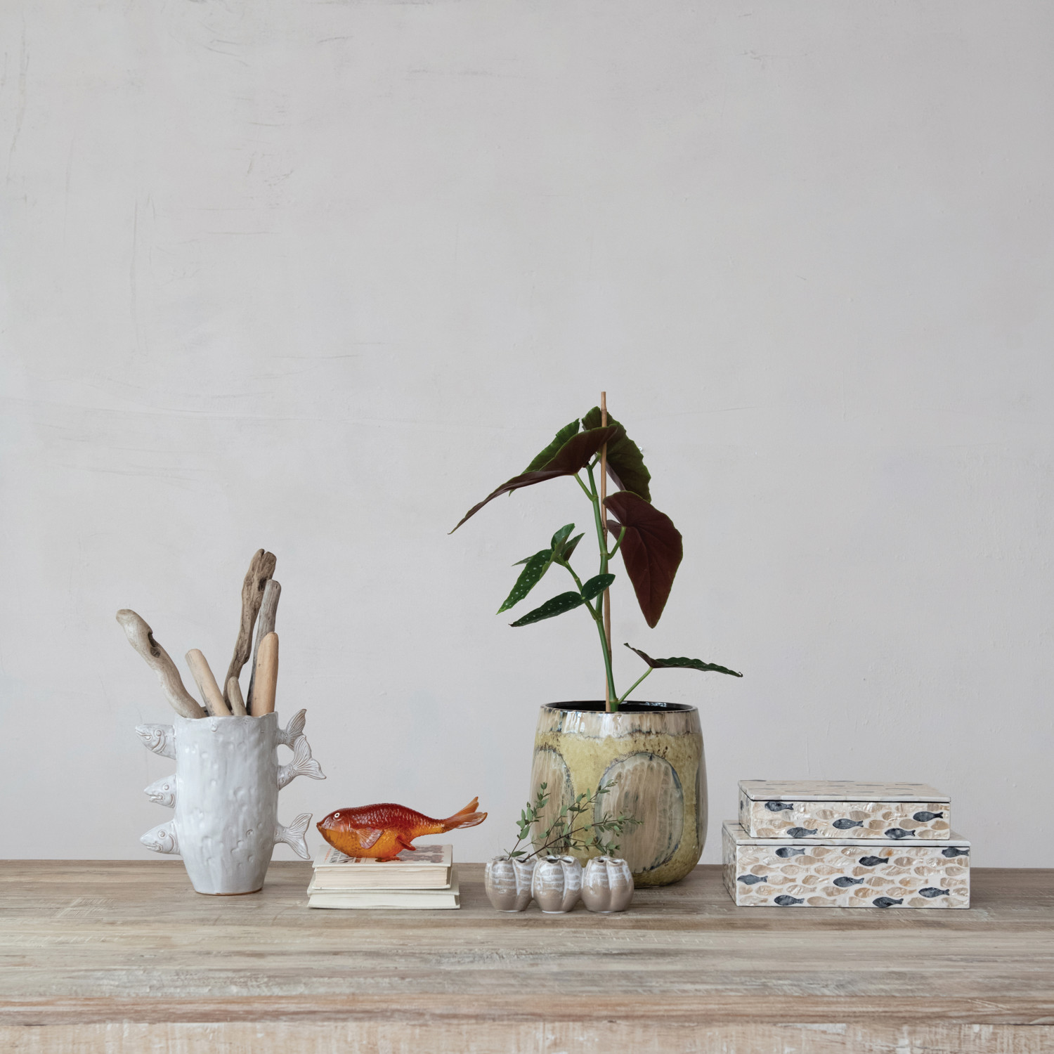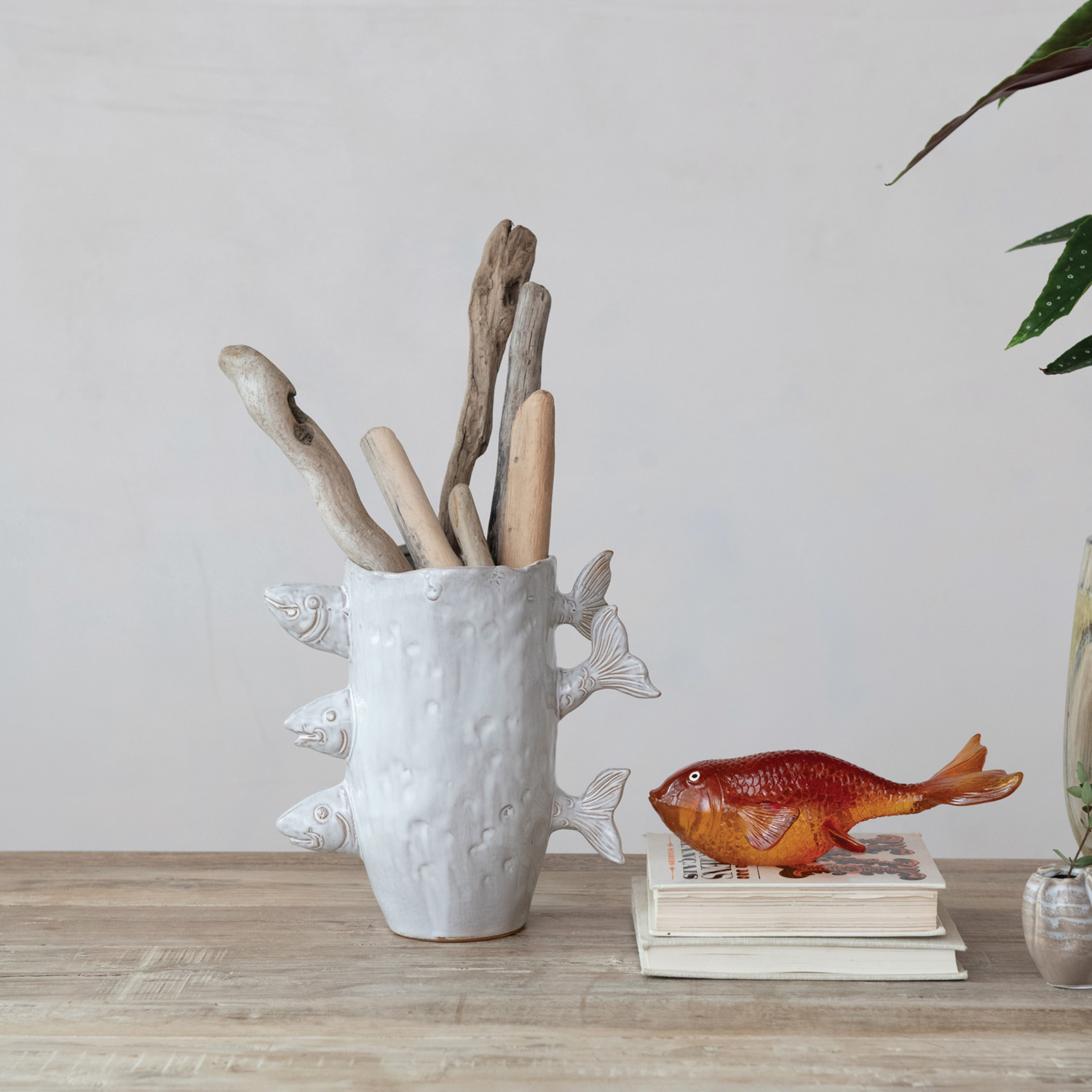 Stoneware Vase w/ 3D Fish, Reactive Glaze, White (Each One Will Vary)