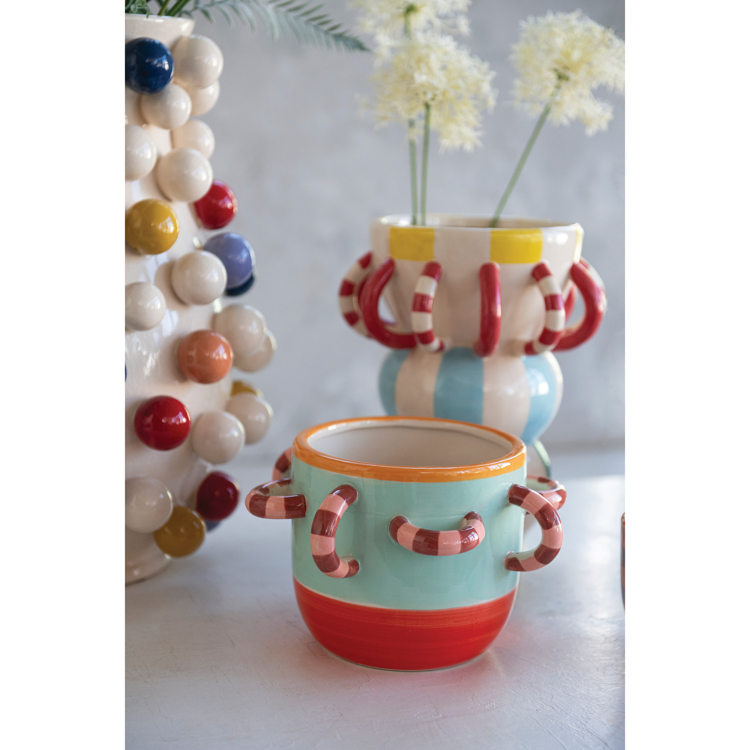 Catalog Name: 8" Round x 10-1/2"H Hand-Painted Stoneware Vase w/ Striped Pattern & 3D Loops, Multi Color