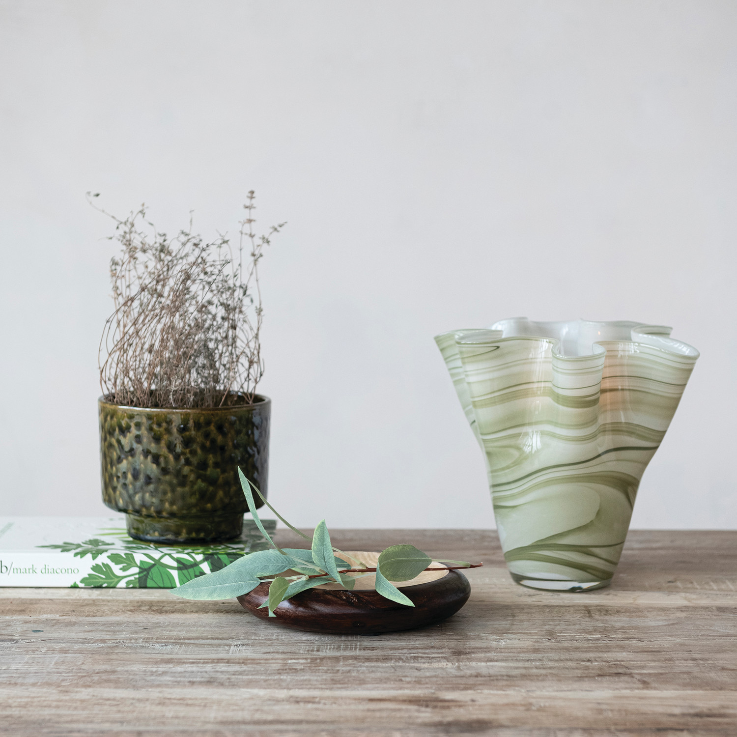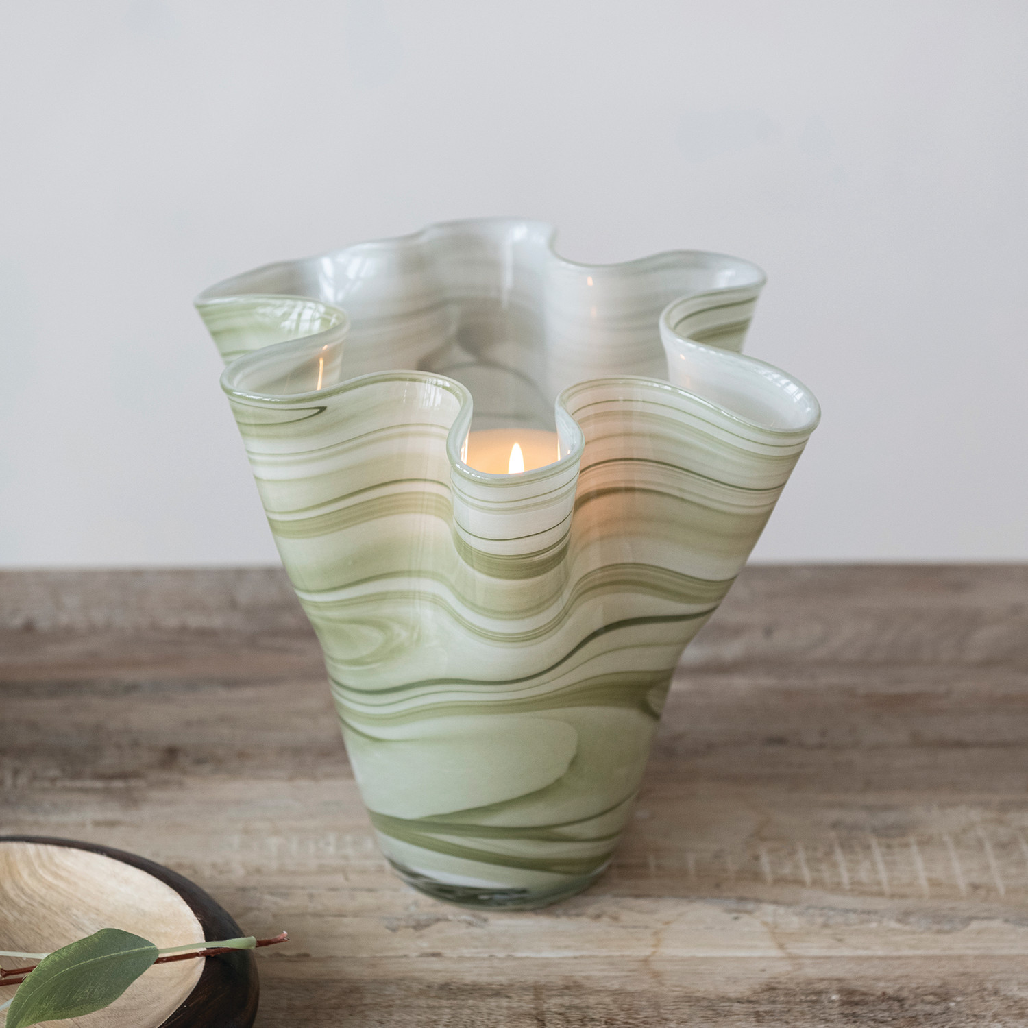 Hand-Blown Glass Ruffled Vase with Swirled Design, Opaque Green & White (Each One Will Vary)