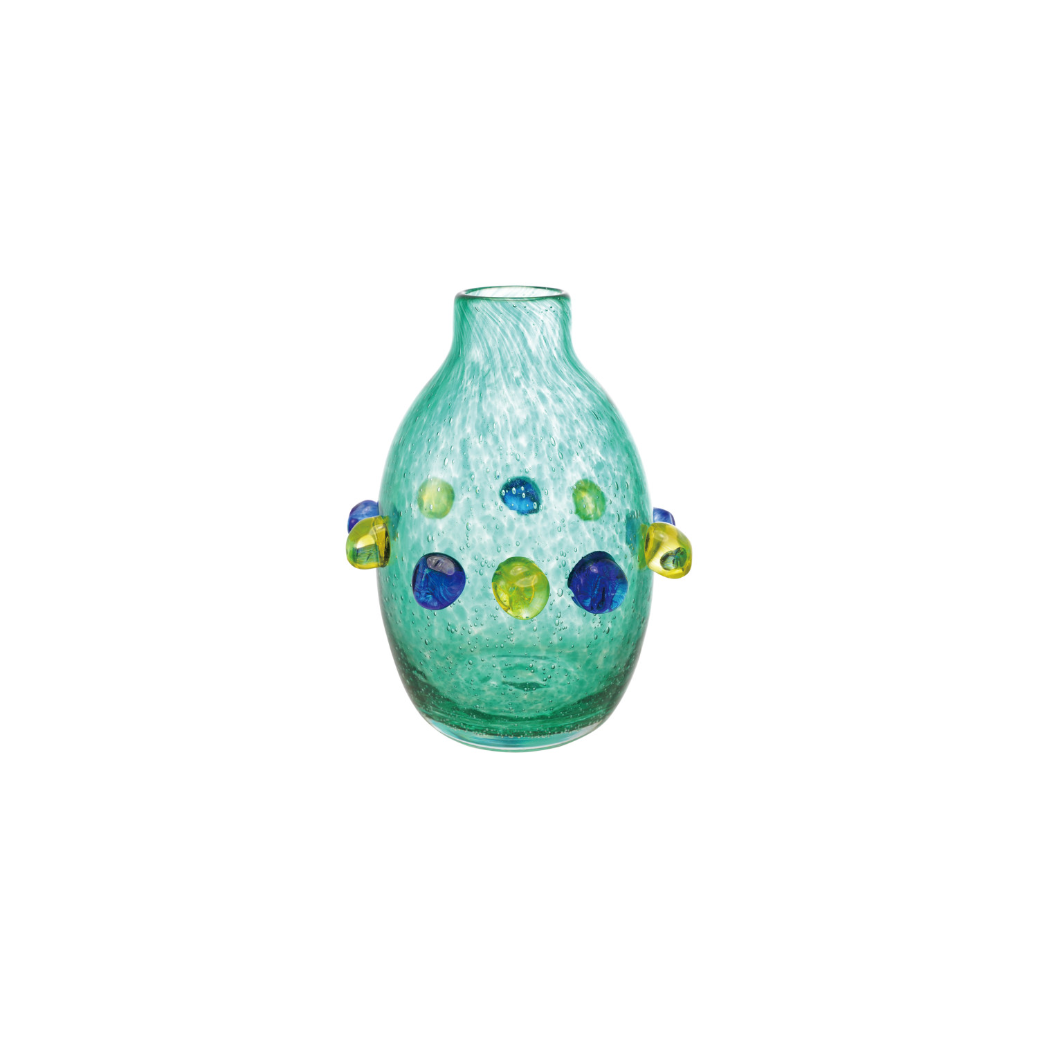 Catalog Name: 5-3/4" Round x 7-3/4"H Hand-Blown Glass Vase w/ 3D Balls, Blue, Green & Yellow (Each One Will Vary)