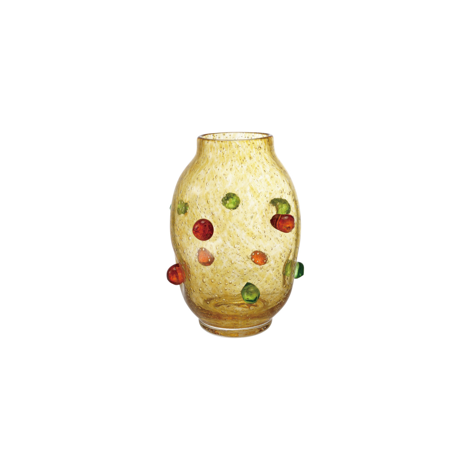 Catalog Name: 6-1/2" Round x 9-1/4"H Hand-Blown Glass Vase w/ 3D Balls, Orange Color, Red & Green (Each One Will Vary)