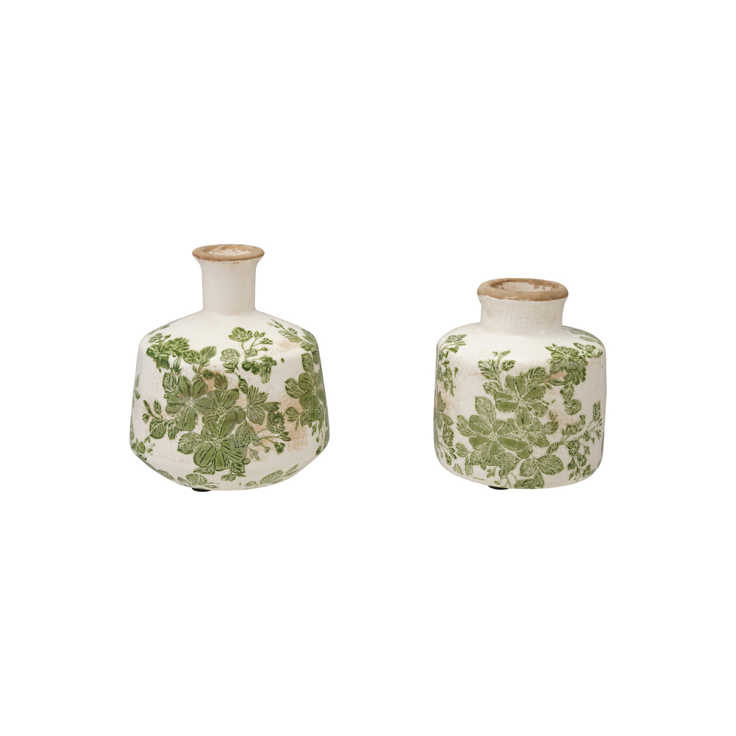 Catalog Name: 4"H - 5"H Stoneware Vase w/ Botanicals, Crackle Glaze, White & Green, 2 Styles (Each One Will Vary)