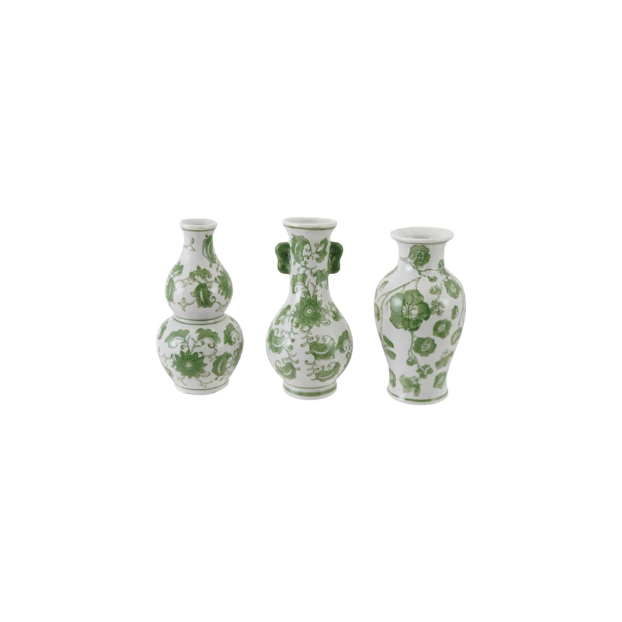 Catalog Name: 3" Round x 7"H Hand-Painted Stoneware Vase w/ Floral Design, Green & White, 3 Styles