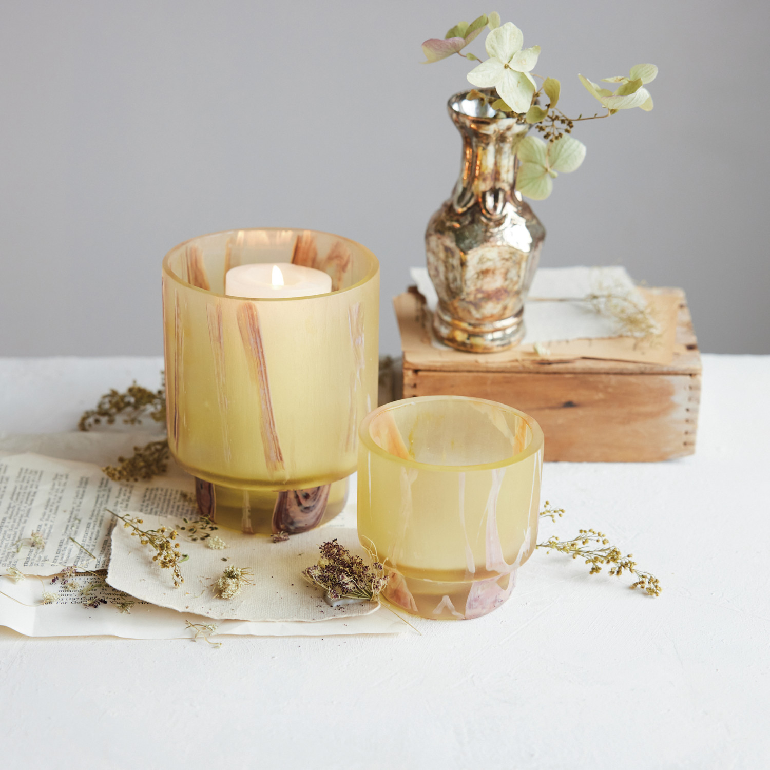 Catalog Name: 4" Round x 5"H Art Glass Footed Tealight/Votive Holder, Marbled Yellow, Brown & Orange Color (Each One Will Vary)