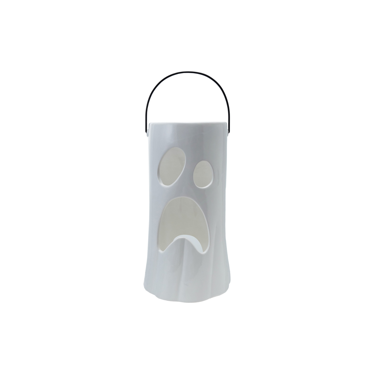 Catalog Name: 7-1/4" Round x 14-1/2"H Ceramic Lantern w/ Cut-Out Ghost Face & Metal Handle, White