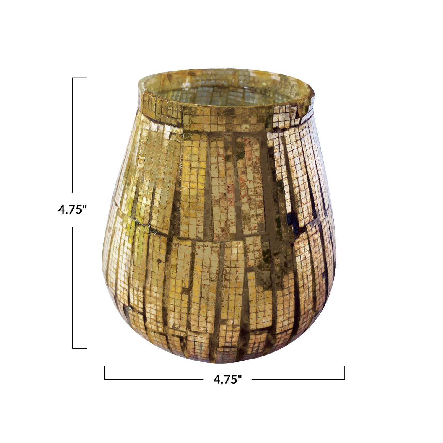 Catalog Name: 4-3/4" Round x 4-3/4"H Recycled Glass Mosaic Votive Holder, Antique Copper Finish