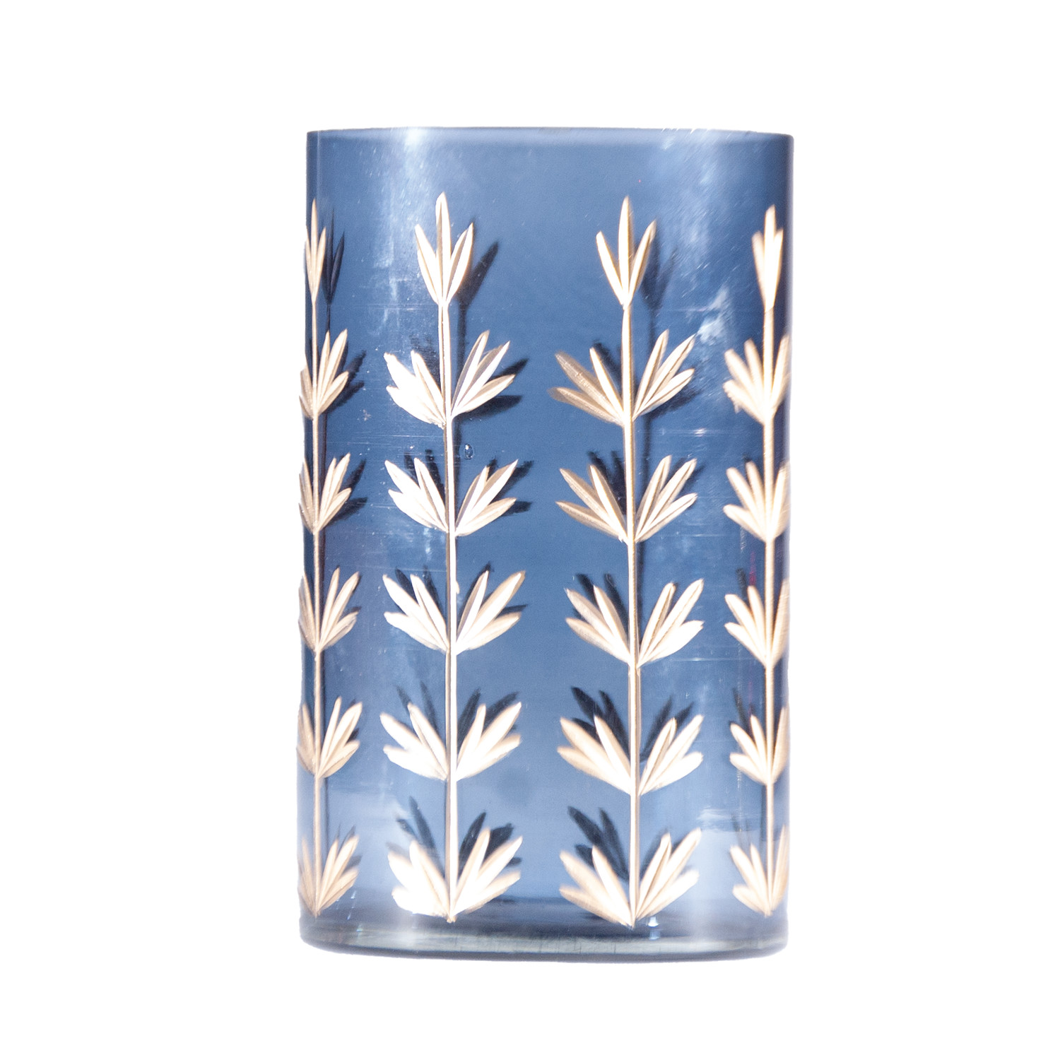 Catalog Name: 4" Round x 6-1/2"H Hand-Painted Cut Glass Candle Holder/Vase w/ Botanical Design, Navy Color & Gold Finish