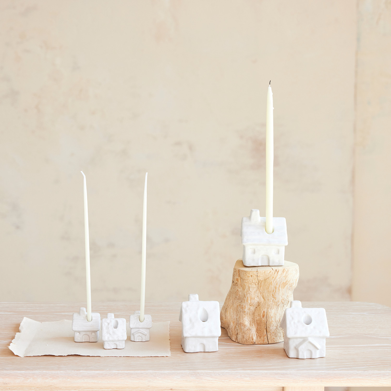 Catalog Name: 2-1/2" Square x 3"H Stoneware House Shaped Taper Holder, Reactive Glaze, White, 3 Styles (Holds 1/2" Taper) (Each One Will Vary)