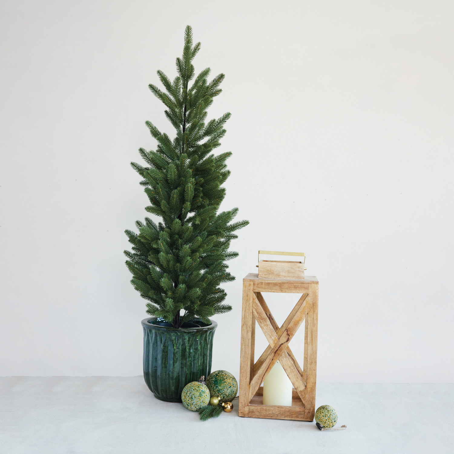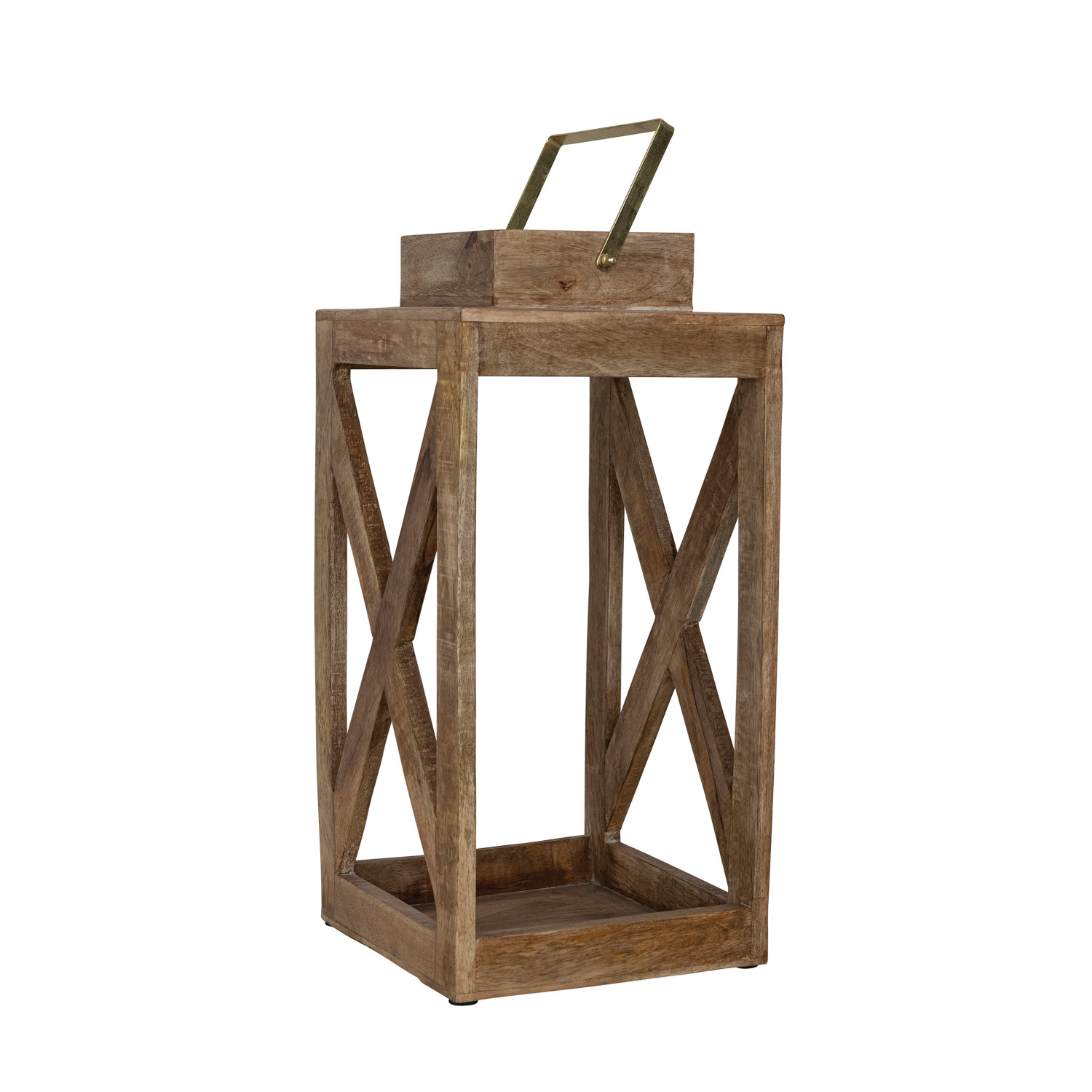 Mango Wood Lantern with Metal Handle, Natural & Gold Finish