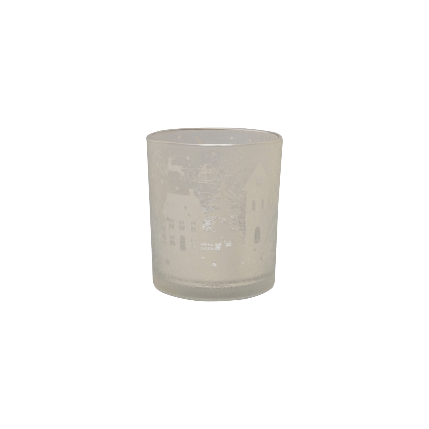 Catalog Name: 3-1/2" Round x 4"H Mercury Glass Tealight/Votive Holder w/ Laser Etched Scene, Silver Finish