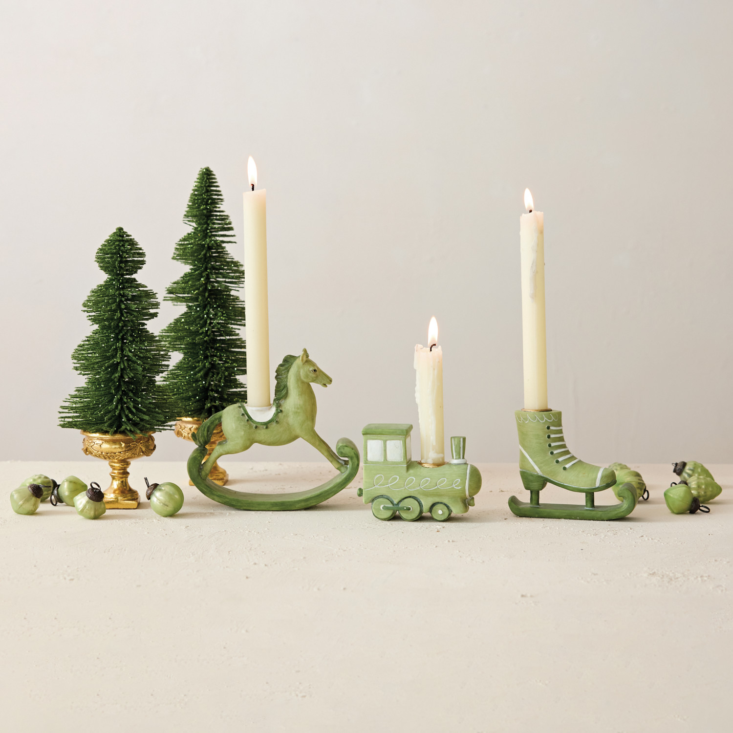 Catalog Name: 6-1/4"L x 6"H Resin Rocking Horse Shaped Taper Holder, Green & White ©