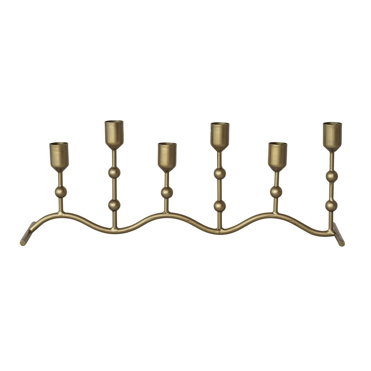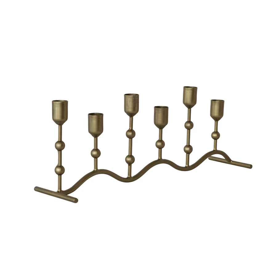 Catalog Name: 15-3/4"L x 4"W x 5-3/4"H Hand-Forged Iron Candle Runner w/ Balls & Curved Base, Antique Gold Finish (Holds 6 Tapers)