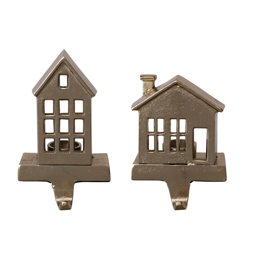 Cast Aluminum House Shaped Tealight Stocking Holder, Gold Finish, 2 Styles