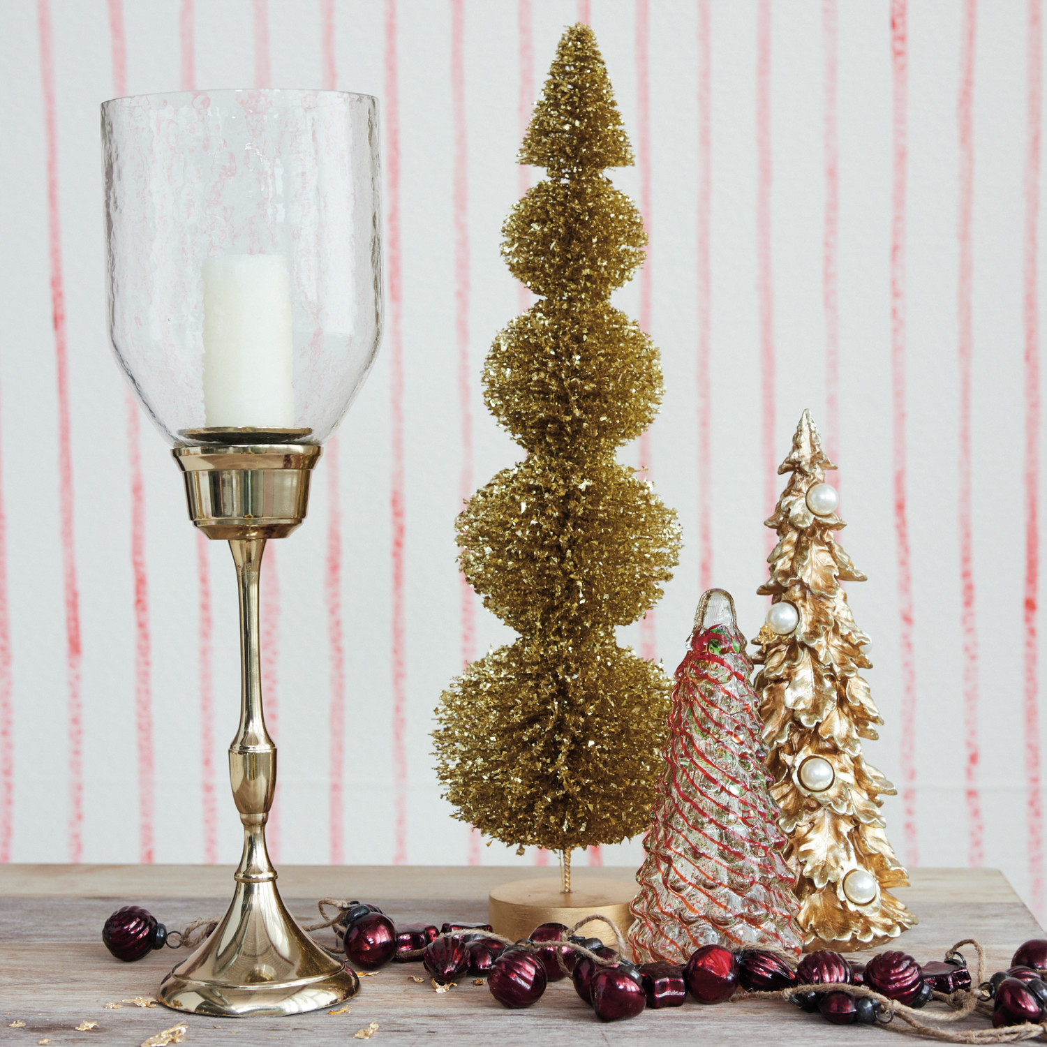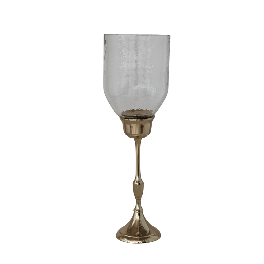Catalog Name: 6-1/4" Round x 19-3/4"H Glass Hurricane w/ Metal Base, Gold Finish, KD (Holds 2-1/2" Pillar)