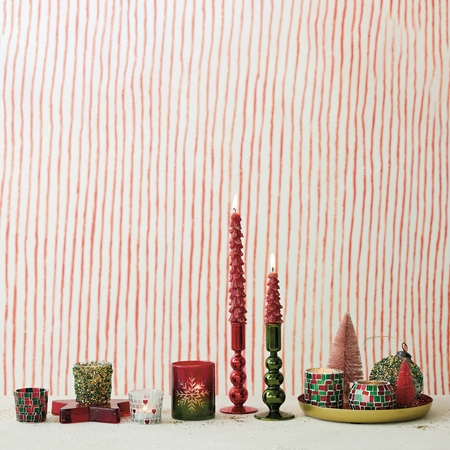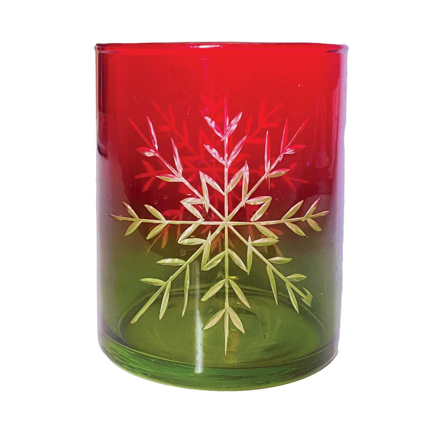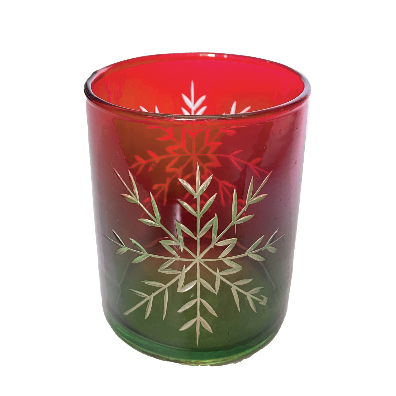 Etched Glass Votive Holder with Snowflakes, Red & Green